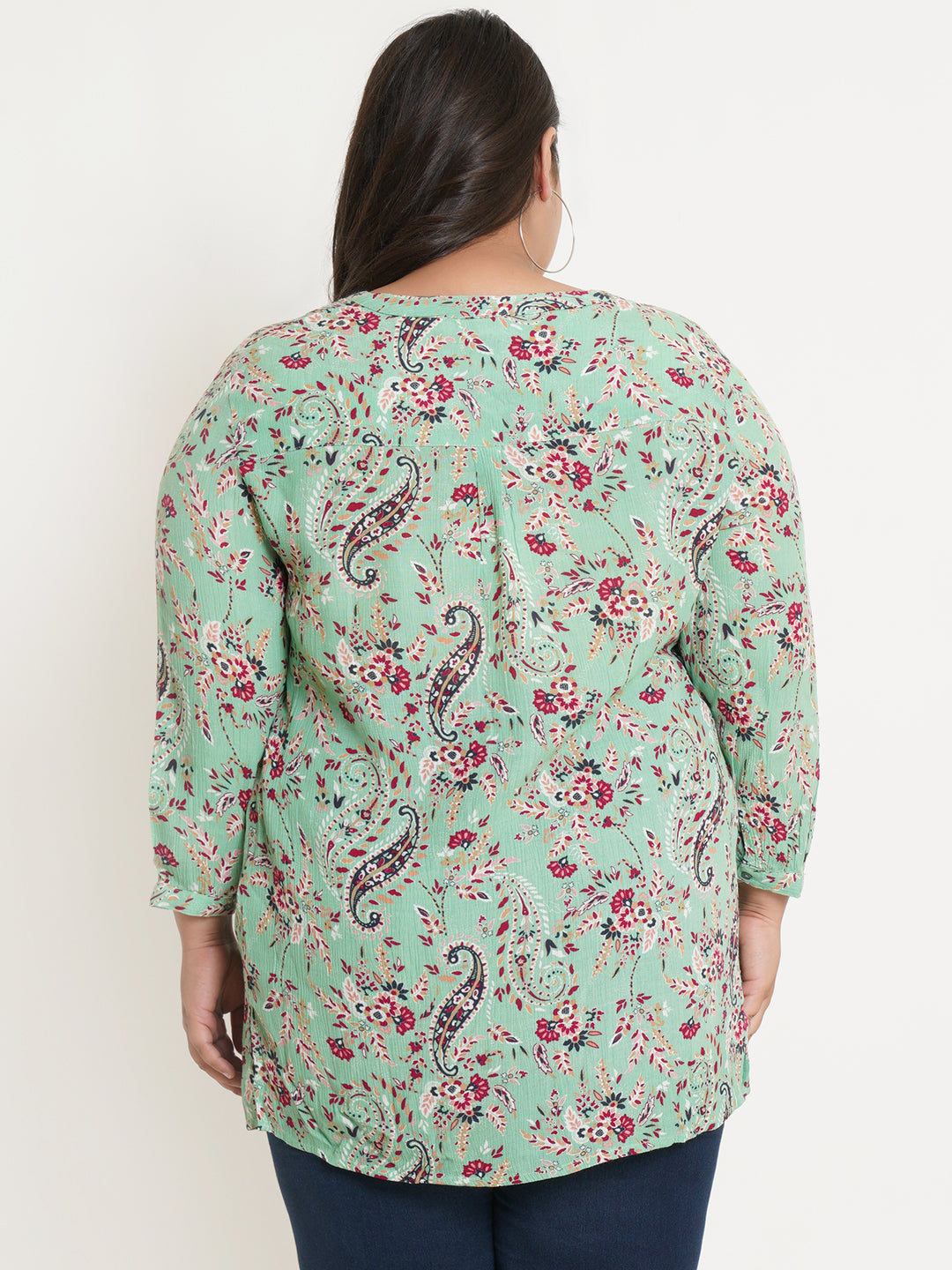 Plus size women pintuck top with side slit, Has mandarin collar, Three-Quarter Sleeves, button closure.