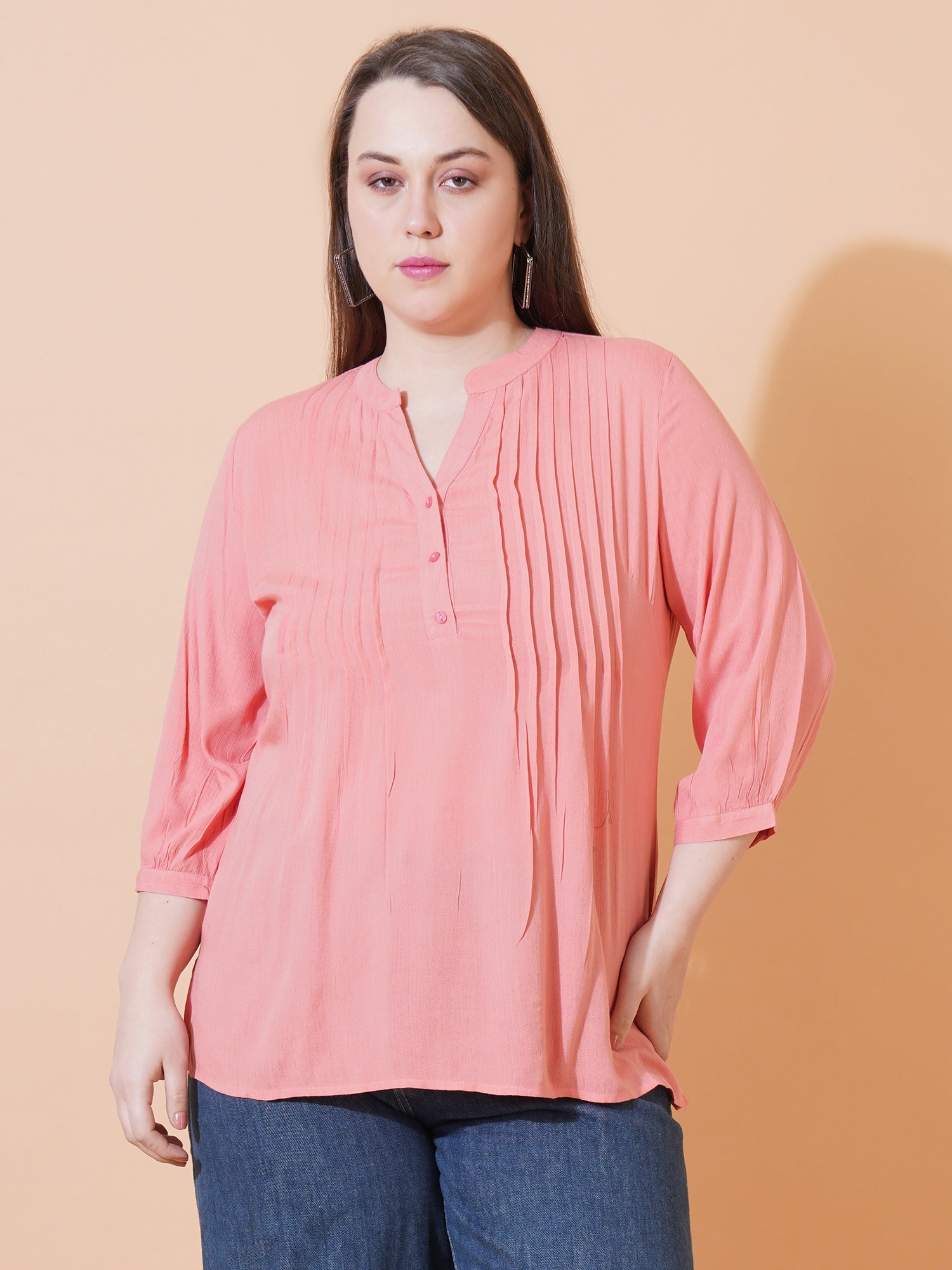 Women Pink Solid Pintuck Plus Size Top