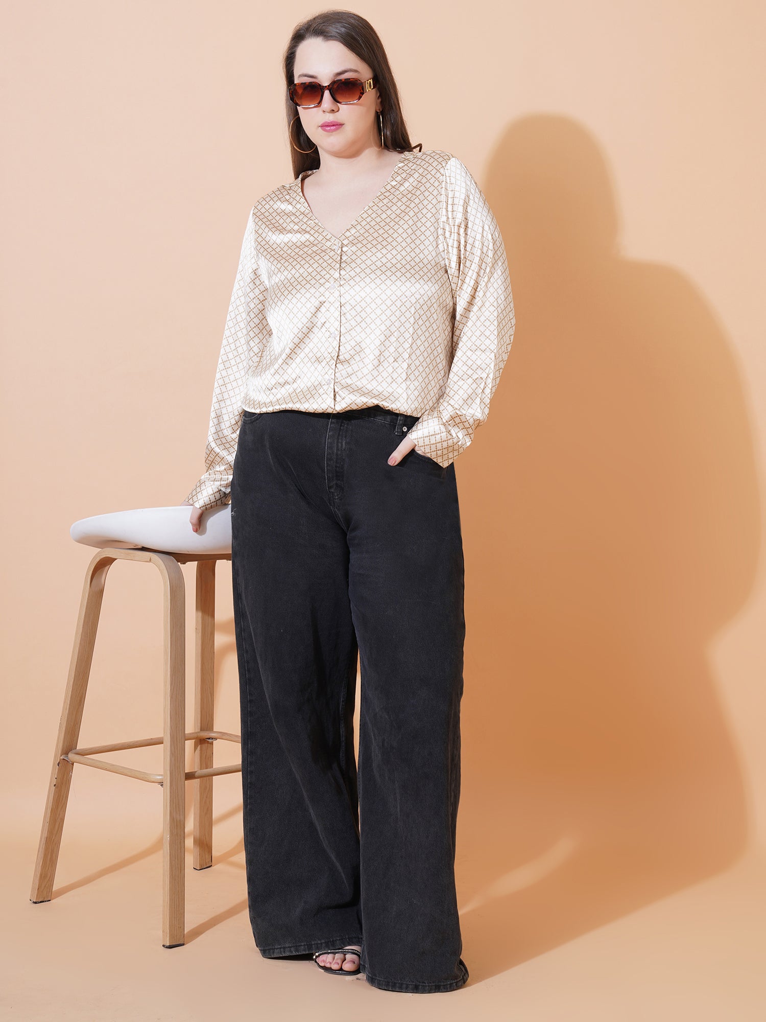 Women White & Brown Checkred Full Sleeves Satin Plus Size Shirt Style Top
