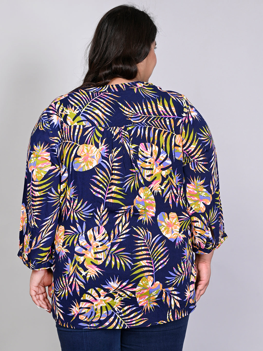Women Plus Size Navy Blue & Green Printed Pintuck Mandarin Collar Longline Top