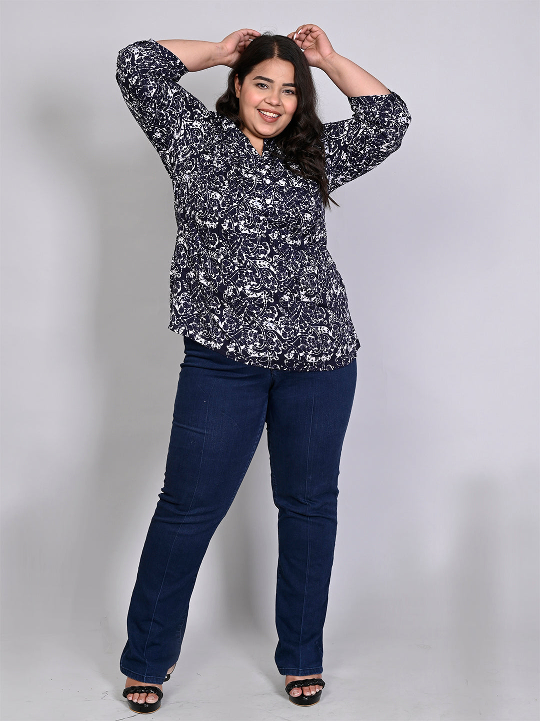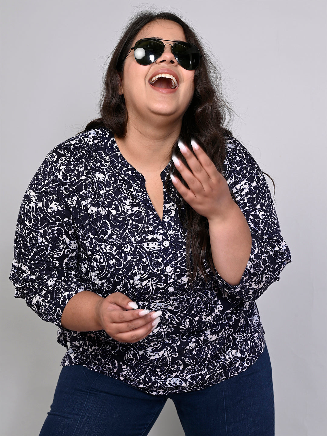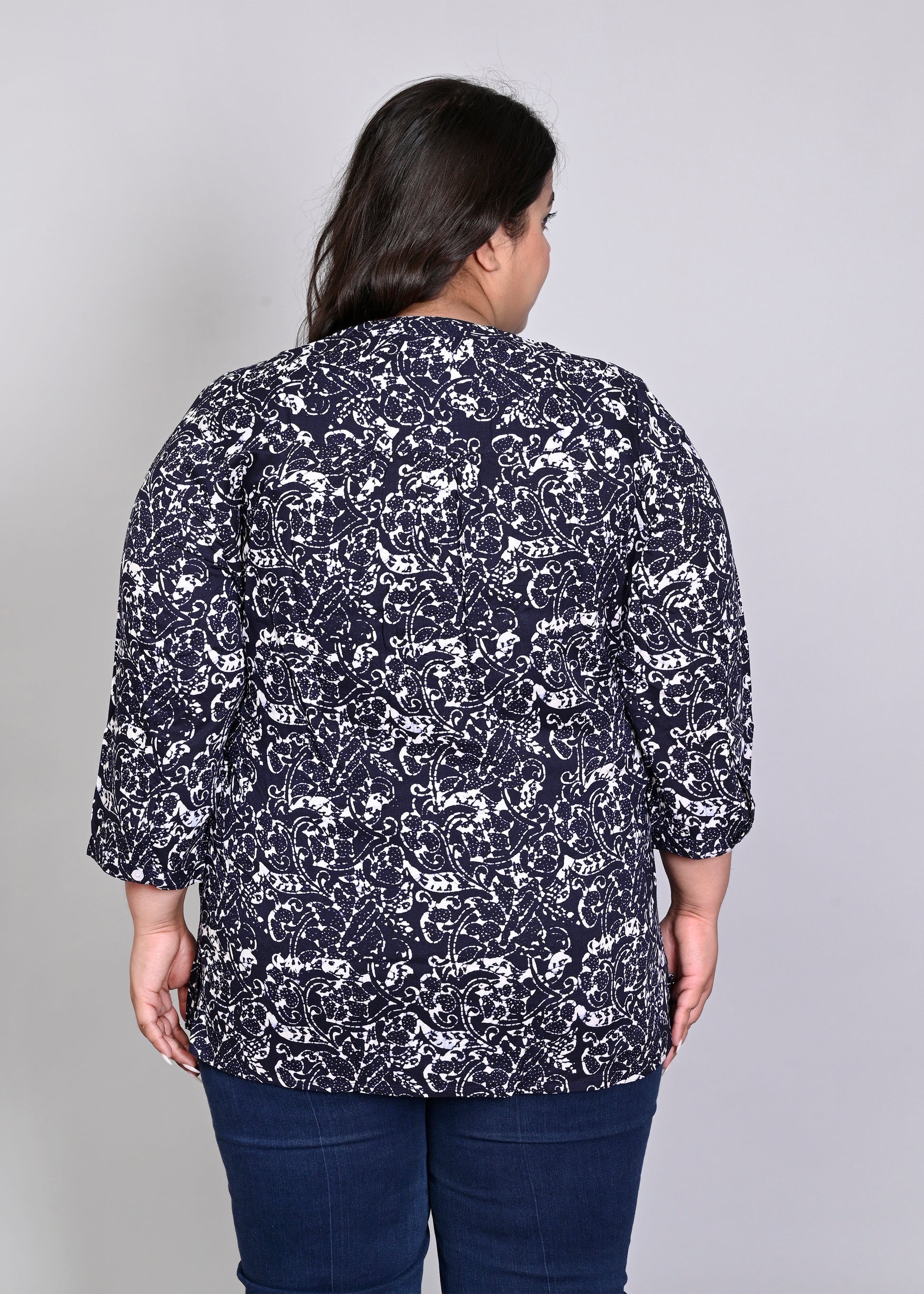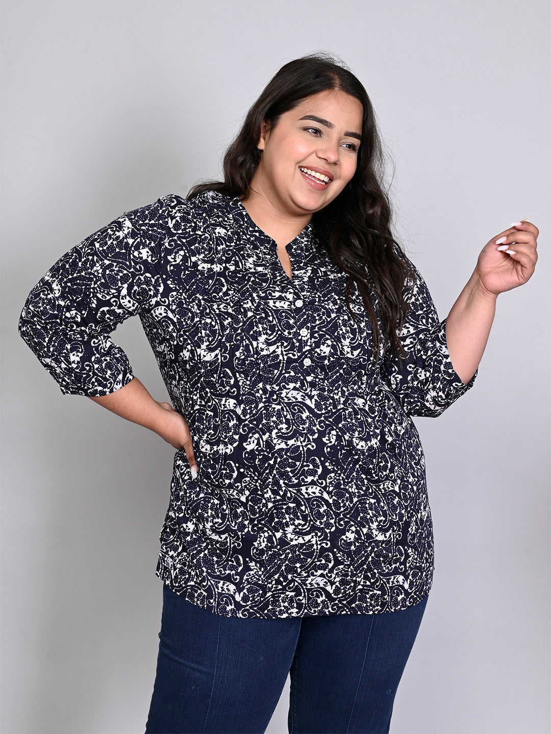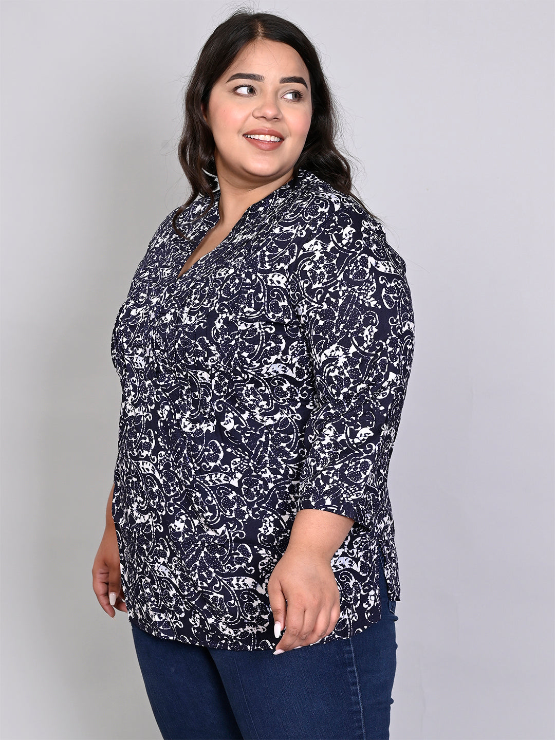 Women Plus Size Navy Blue & White Printed Pintuck Mandarin Collar Longline Top
