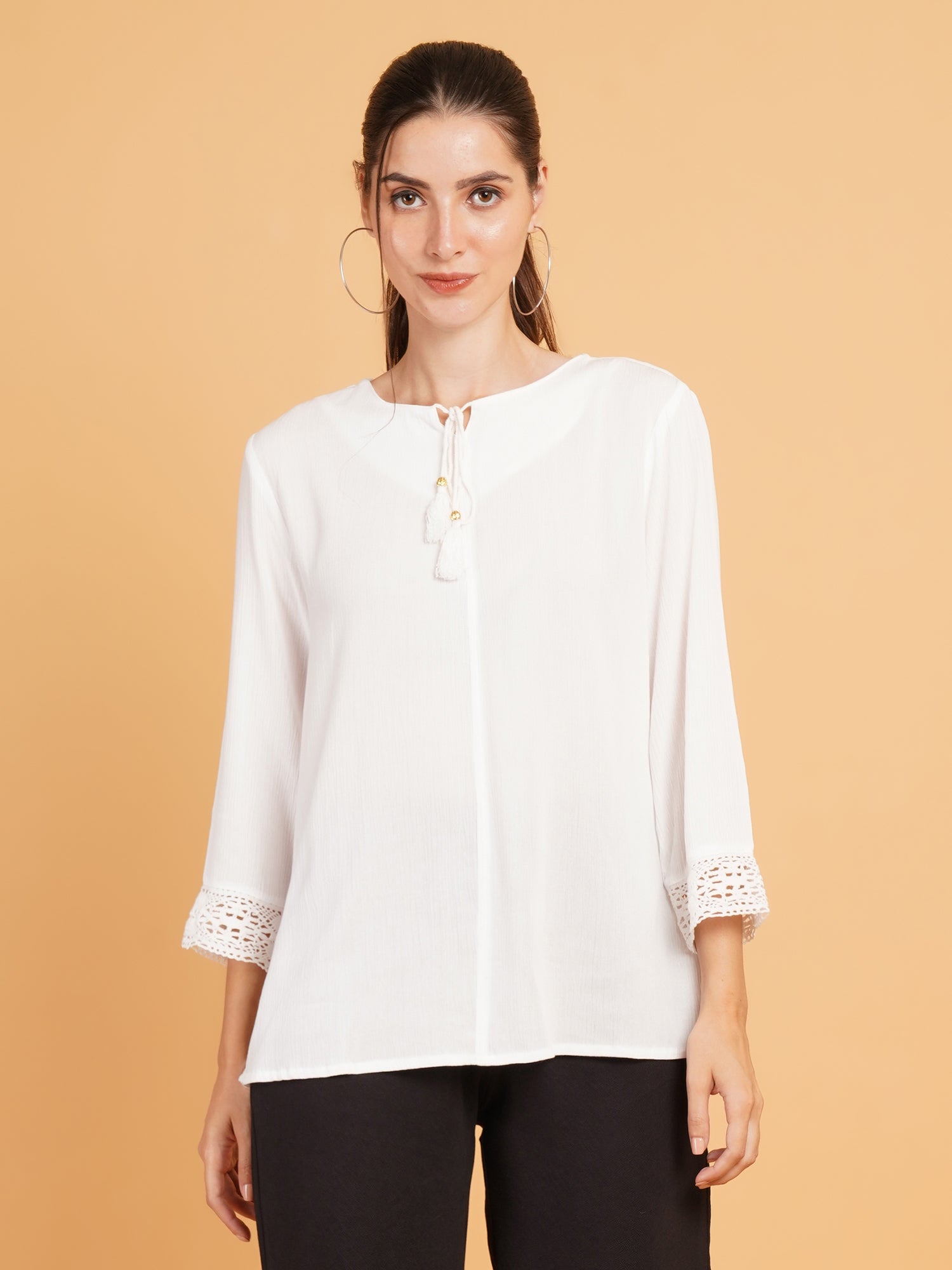 The Alveria Top is a timeless ode to understated elegance. Crafted from luxurious fabric, it features delicate lace inserts and a graceful tie-up neckline that frames the face with subtle refinement. Designed in a flattering regular fit, Alveria melds comfort with classic femininity, making it the perfect choice for both everyday wear and special occasions.