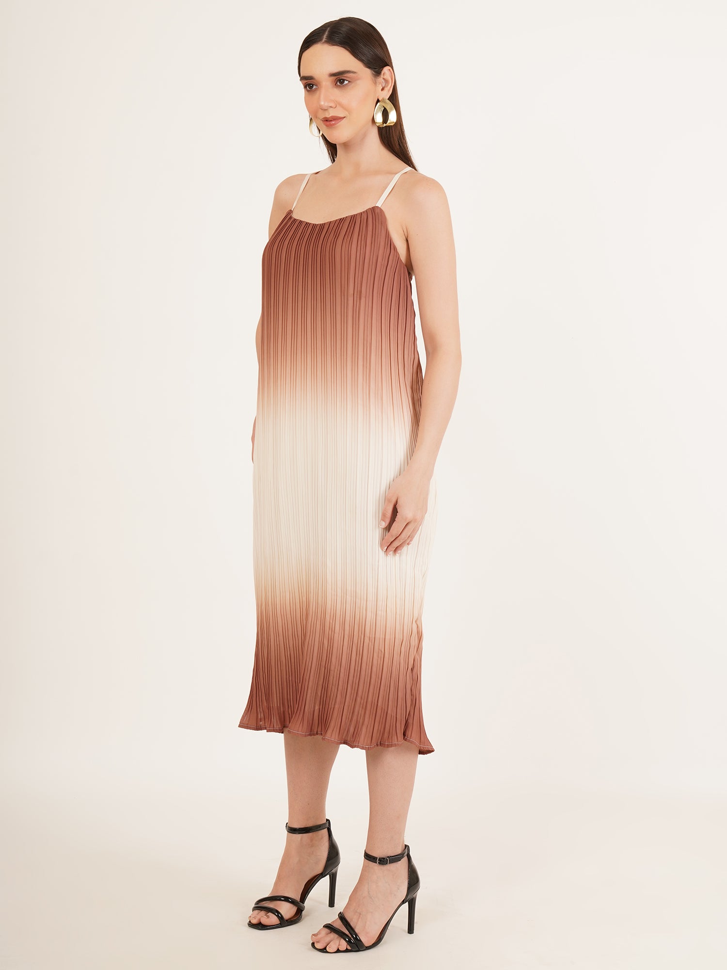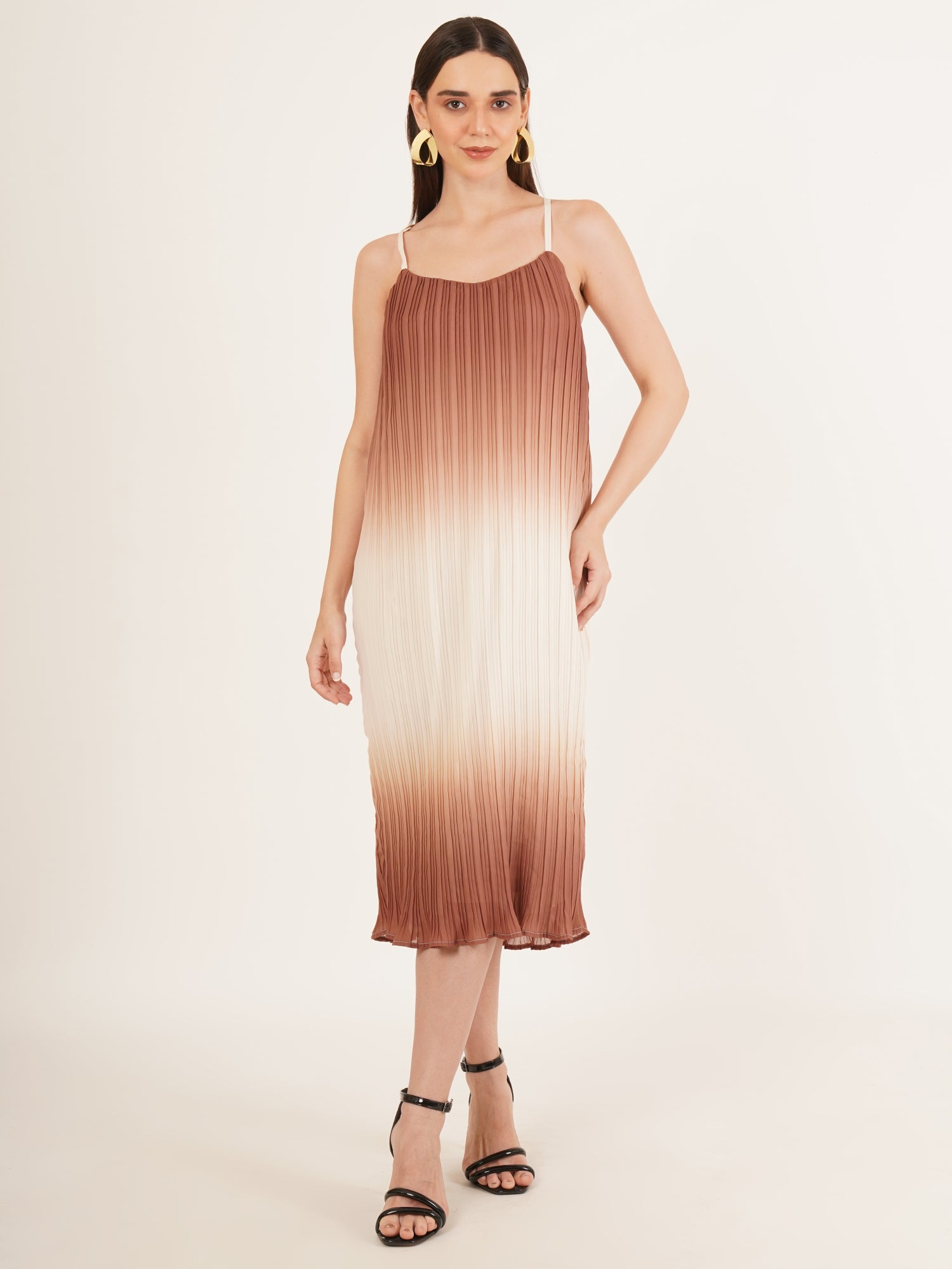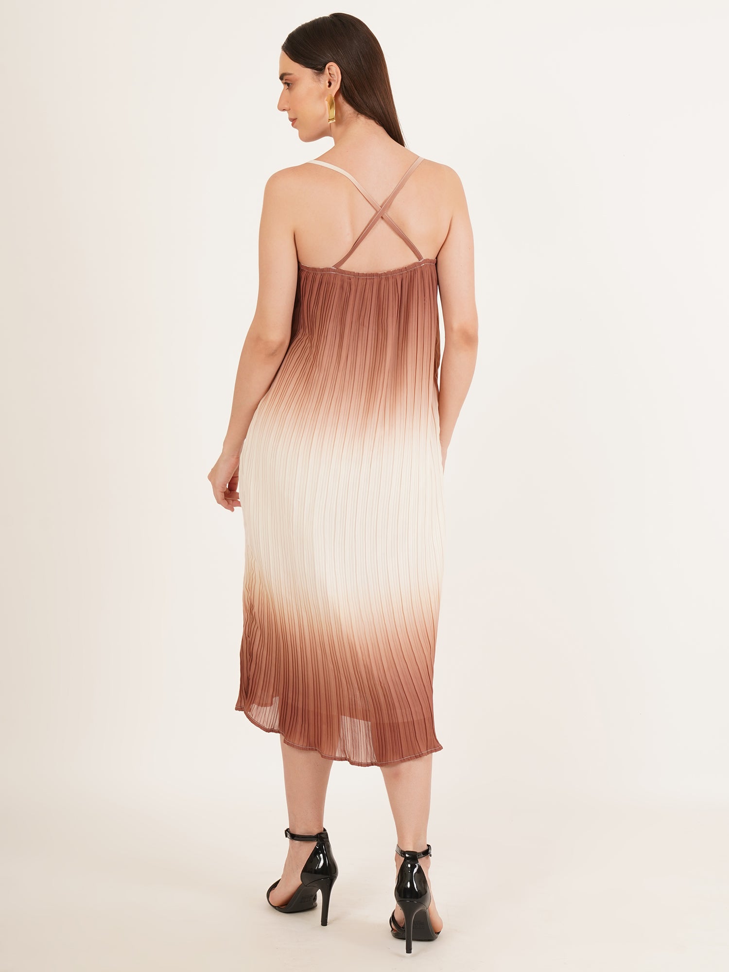 Light and unrestrained, The Anivelle Dress is crafted in soft, airy polyester that flows with ease and intention. Rendered in a refined tie & dye palette of brown and black, the pattern recalls natural stone and shifting sands. Slim shoulder straps frame the neckline, while delicate pleats lend quiet structure to the silhouette. Equally suited to a seaside holiday or an intimate evening gathering, it is a dress designed for understated presence—graceful, modern, and quietly assured.