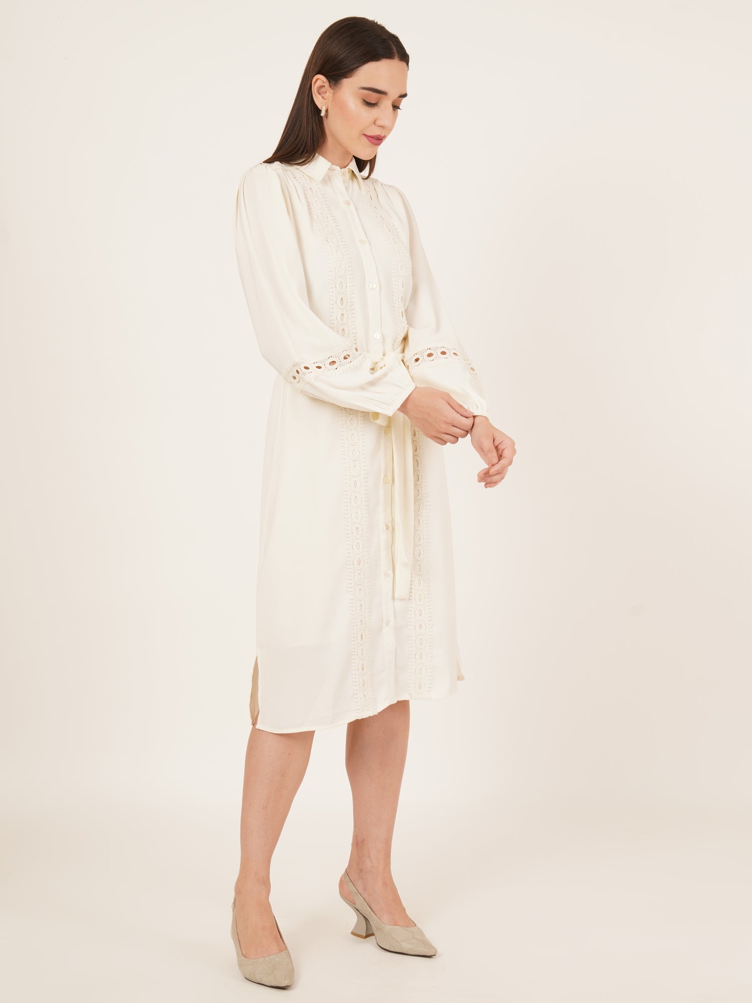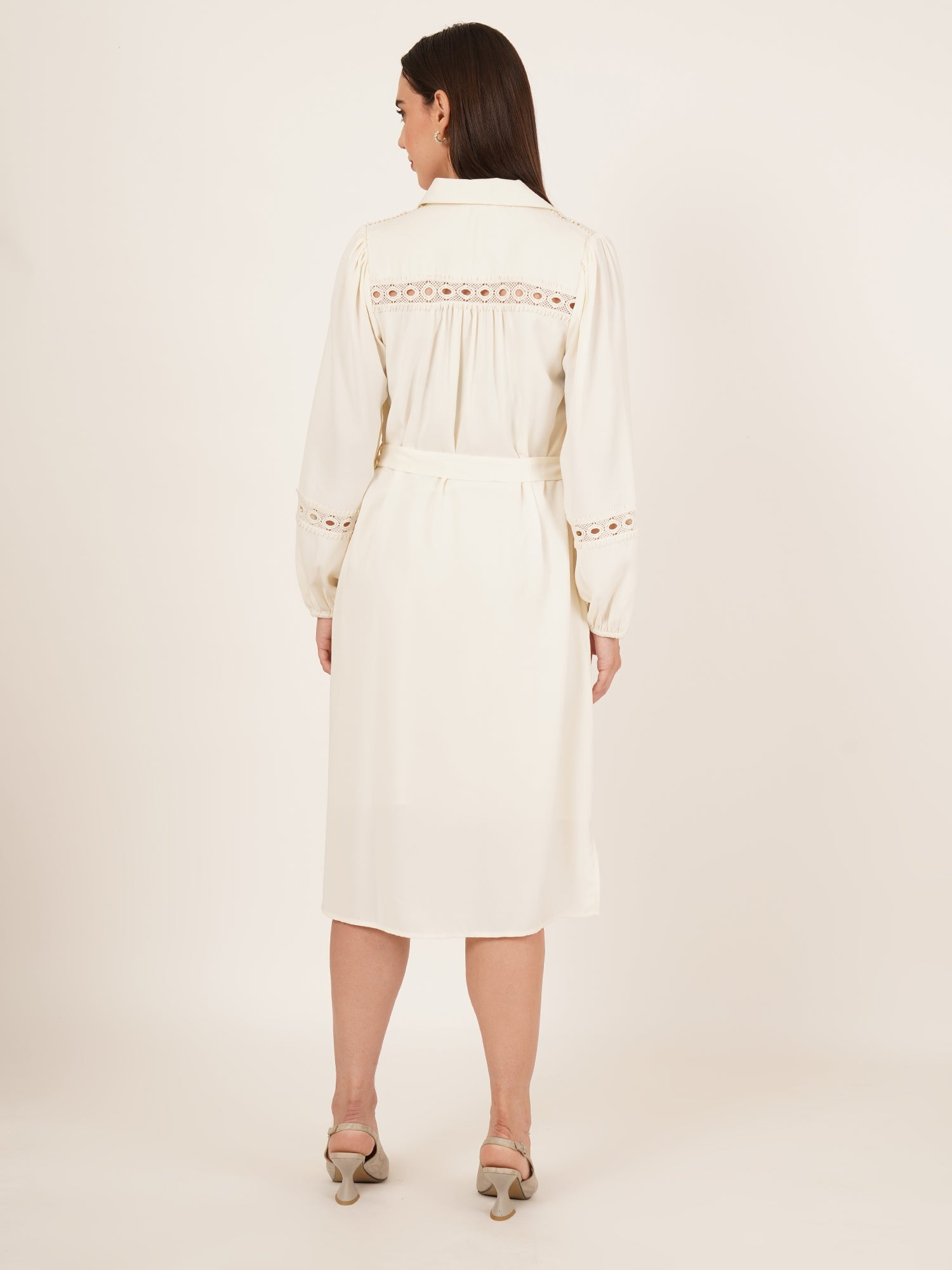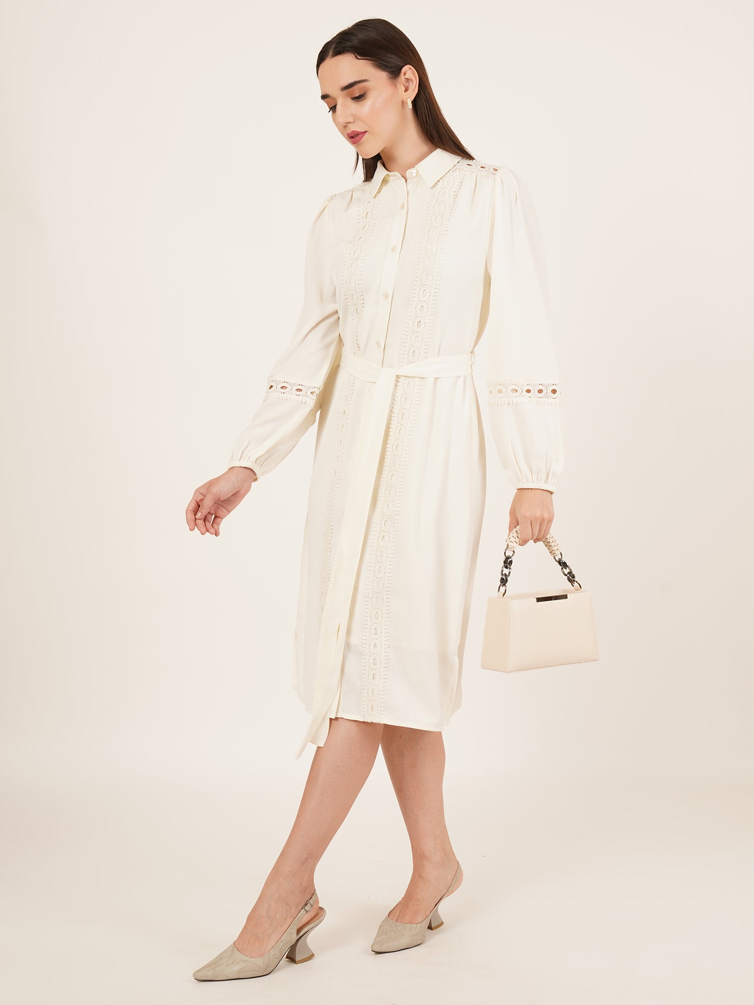 Experience the epitome of refined elegance with The Ashford Dress — a masterful creation that blends timeless design with modern grace. Crafted from premium 100% polyester with a soft 100% cotton lining, this dress is a harmonious fusion of comfort and luxury. The crisp collar, front button closure, and full sleeves are beautifully complemented by intricate lace inserts on the front, shoulders, and sleeves, adding a delicate touch of femininity. The fabric belt cinches the waist for a flattering, adjustable fit, enhancing the dress's graceful silhouette. In its pristine off-white hue, The Ashford Dress is the perfect choice for refined brunches, sophisticated meetings, or elegant daytime events. Elevate your wardrobe with a piece that speaks to both tradition and modern charm.