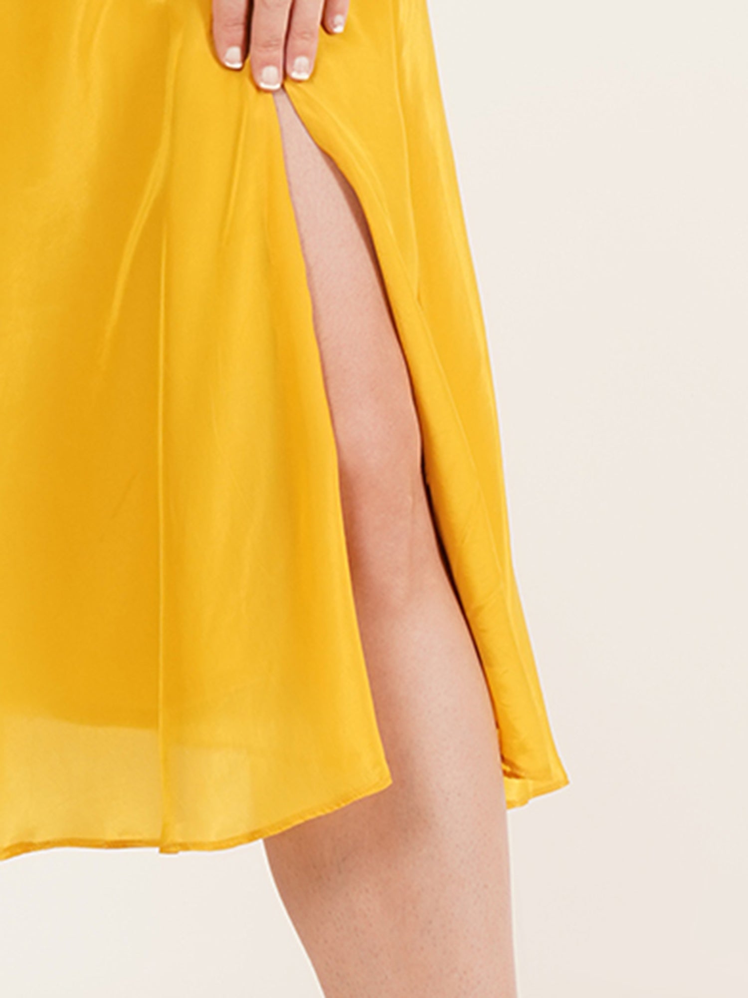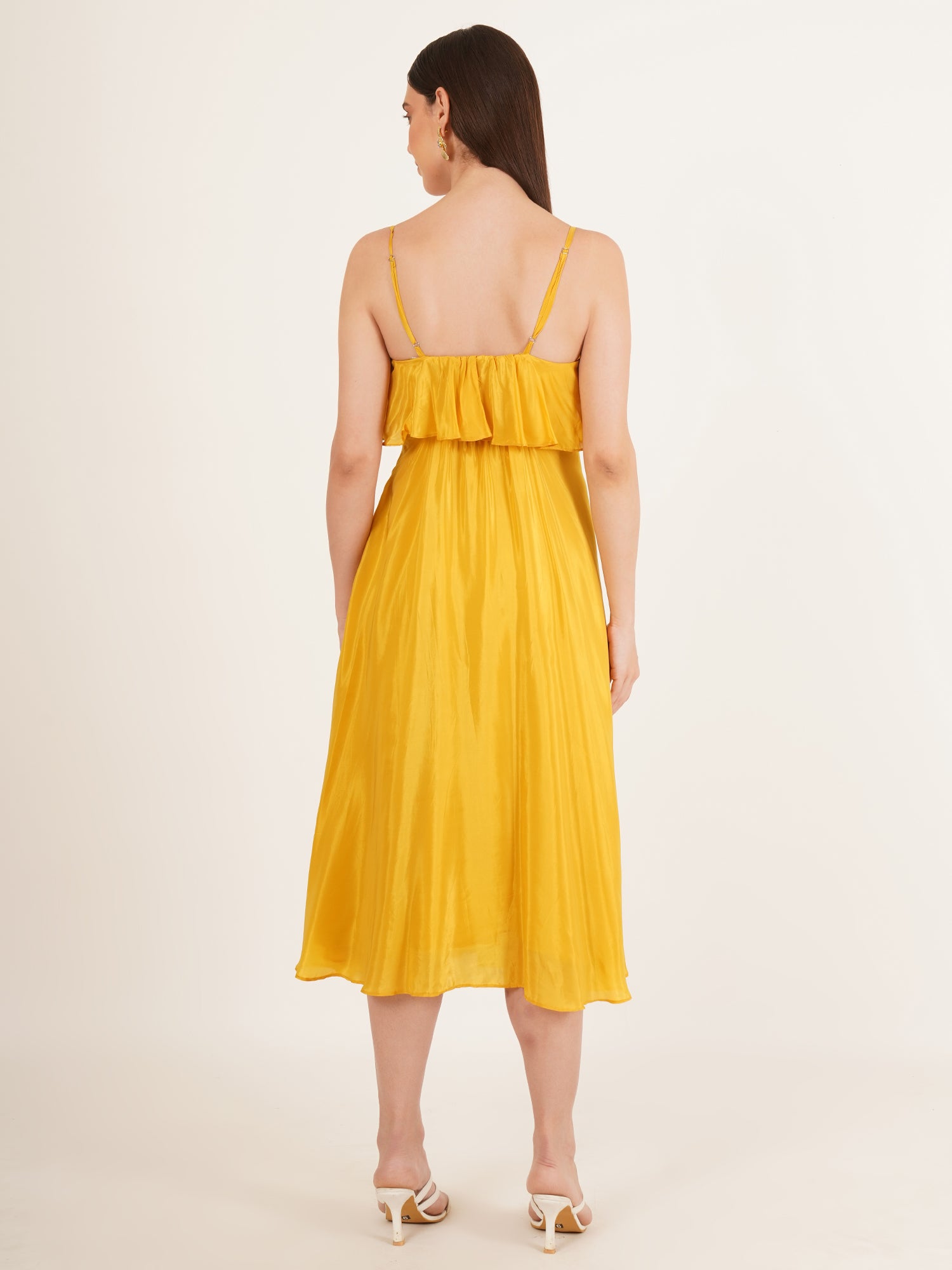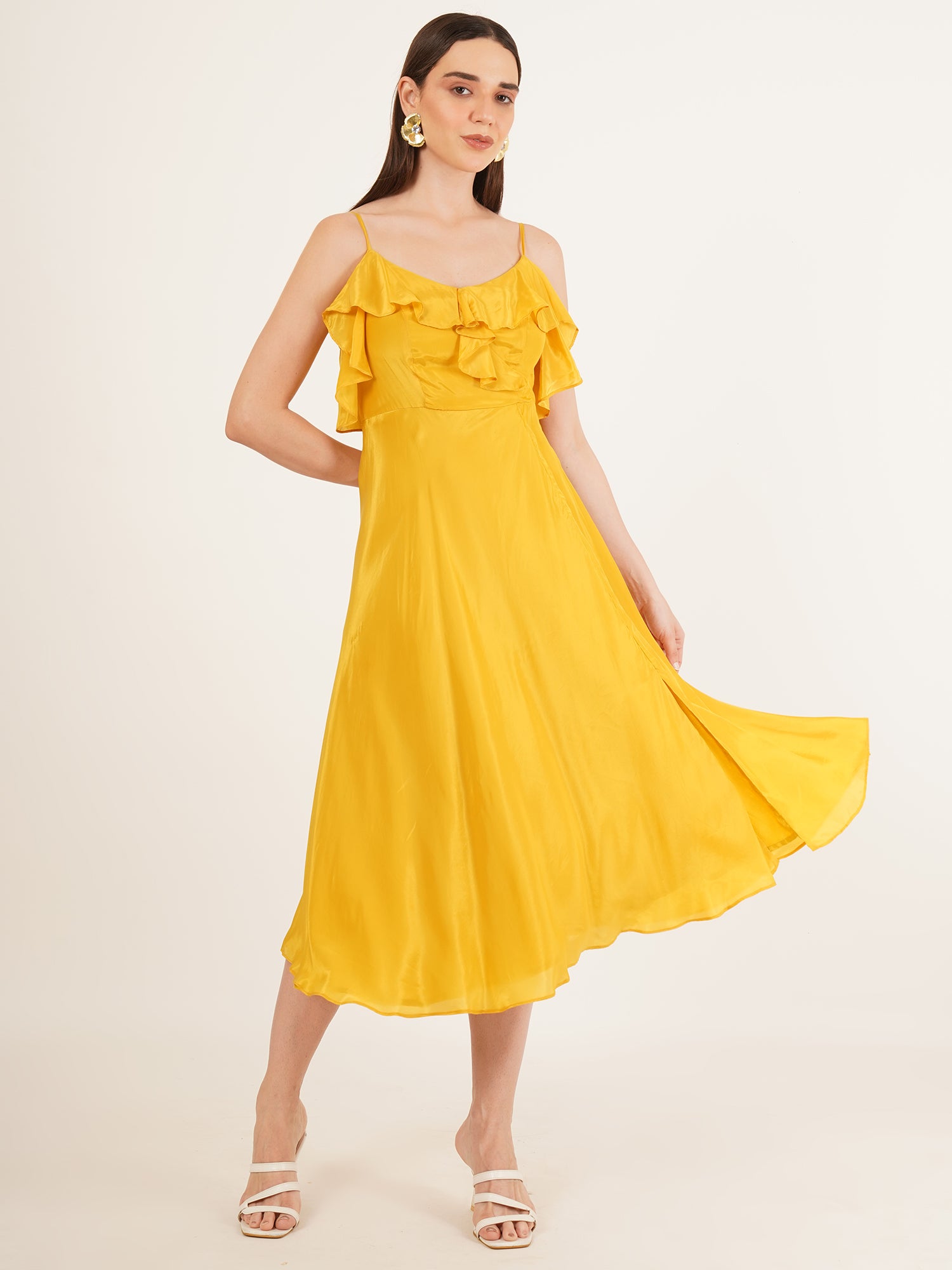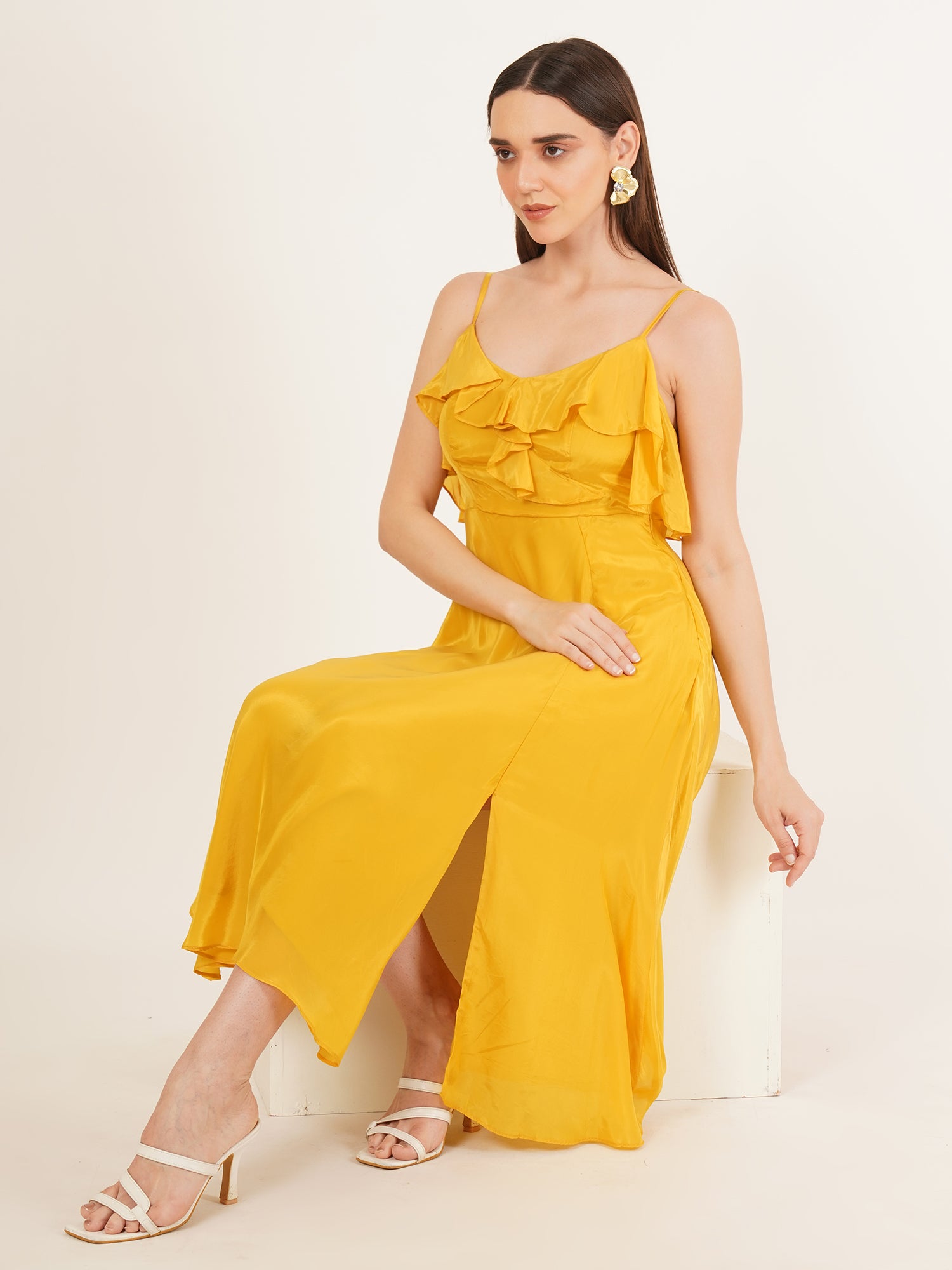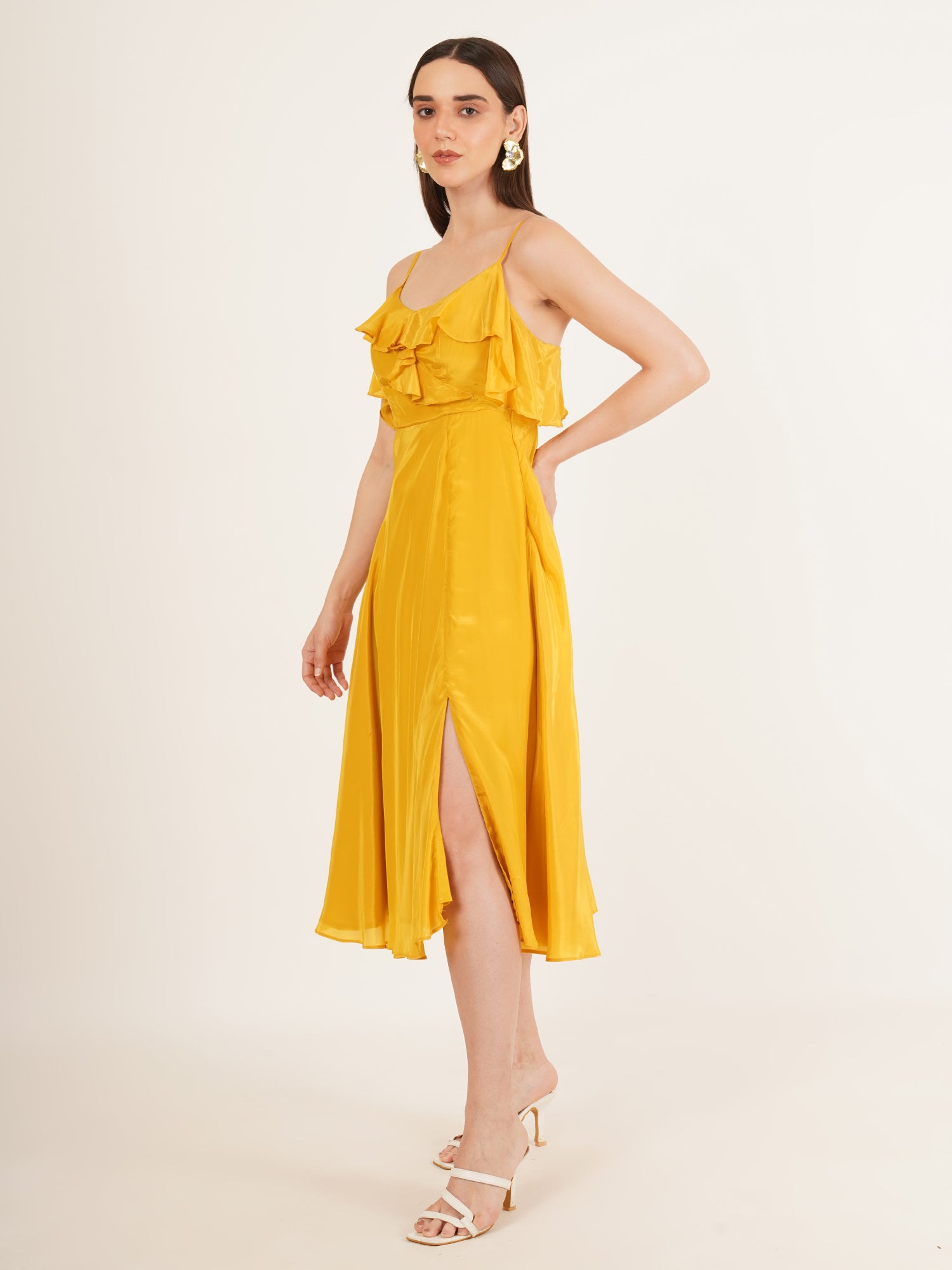 Channel timeless romance with The Belle Ruffle Dress, inspired by the grace and charm of a classic fairytale. Crafted in a lustrous satin finish, this midi silhouette features delicate spaghetti straps, a softly draped ruffle neckline, and a fluid skirt that moves like a dream. A discreet side slit adds a hint of allure, while the smooth polyknit lining ensures day-to-night comfort. Perfect for elegant soirées, candlelit dinners, or any moment you wish to feel like the heroine of your own story.