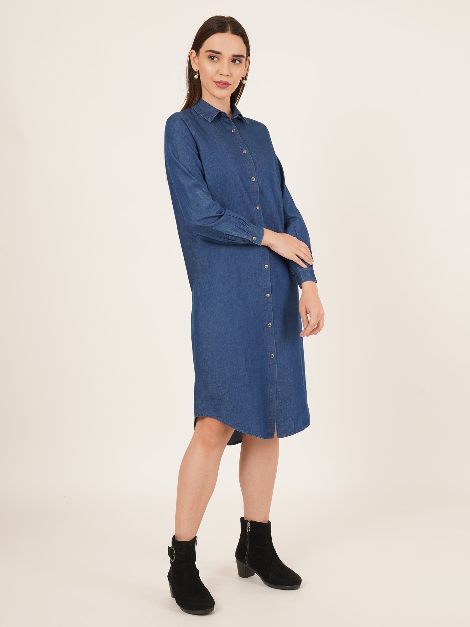 Embody effortless elegance with The Blair Dressa quintessential piece that marries classic design with modern refinement. Expertly crafted from premium denim, this dress features a sophisticated shirt collar, full sleeves, and a subtle front button closure, creating a flattering, tailored silhouette. The relaxed yet structured fit makes it a versatile wardrobe staple, perfect for both casual outings and more elevated moments. Pair with sneakers for a laid-back, chic look, or style with boots and statement accessories for an elevated ensemble. The Blair Dress brings timeless elegance to your everyday style, offering a refined, polished look for any occasion.