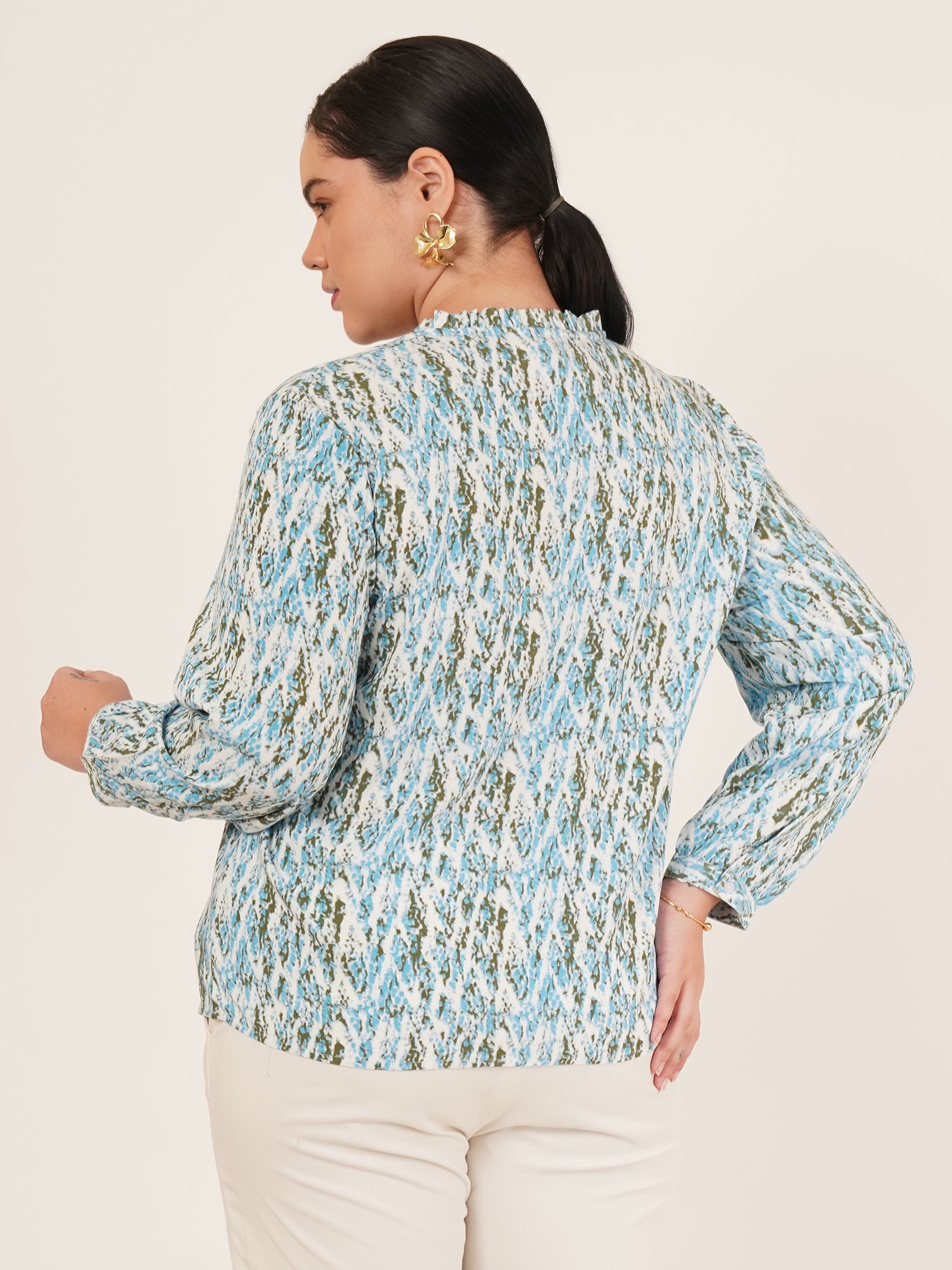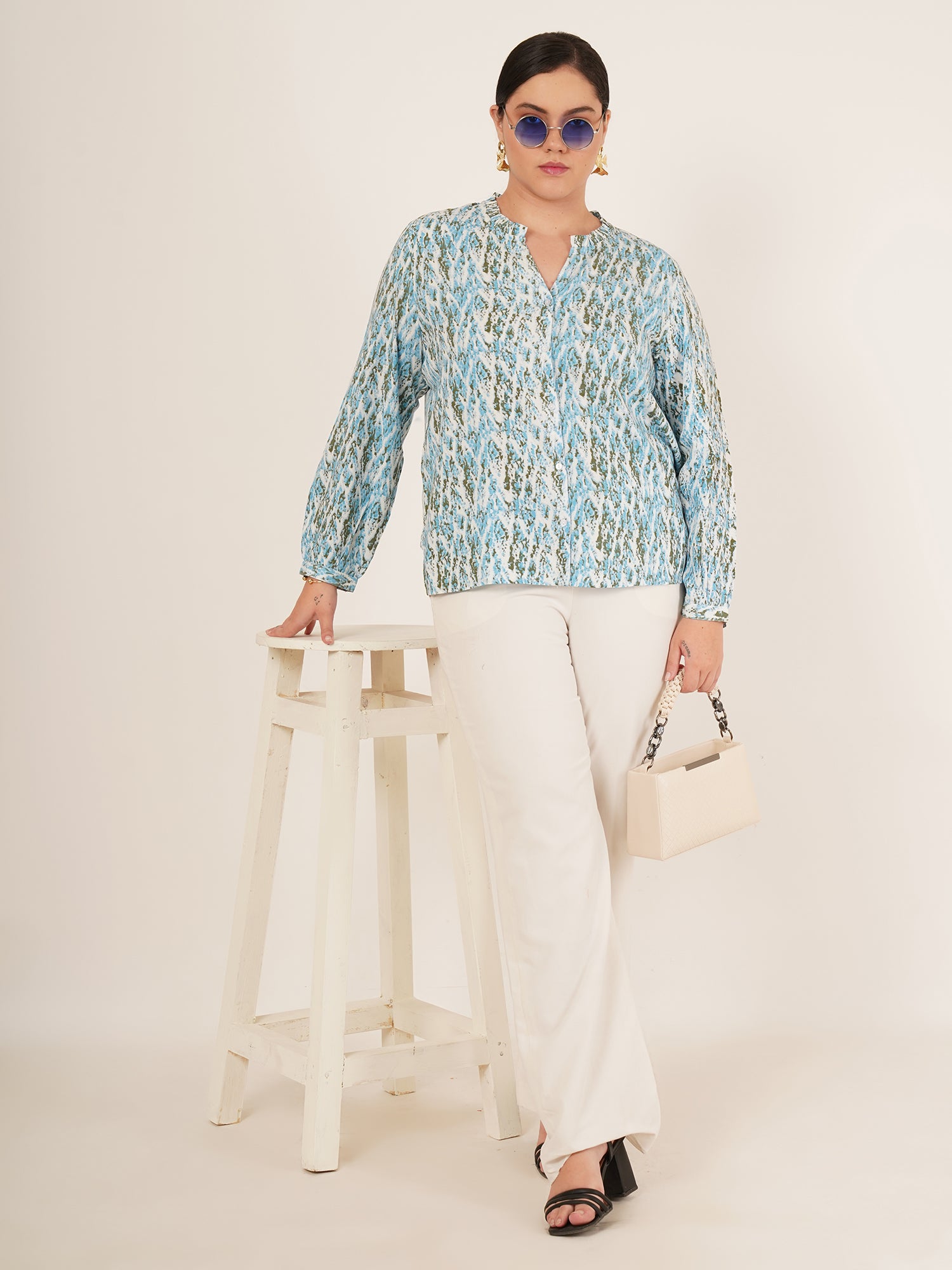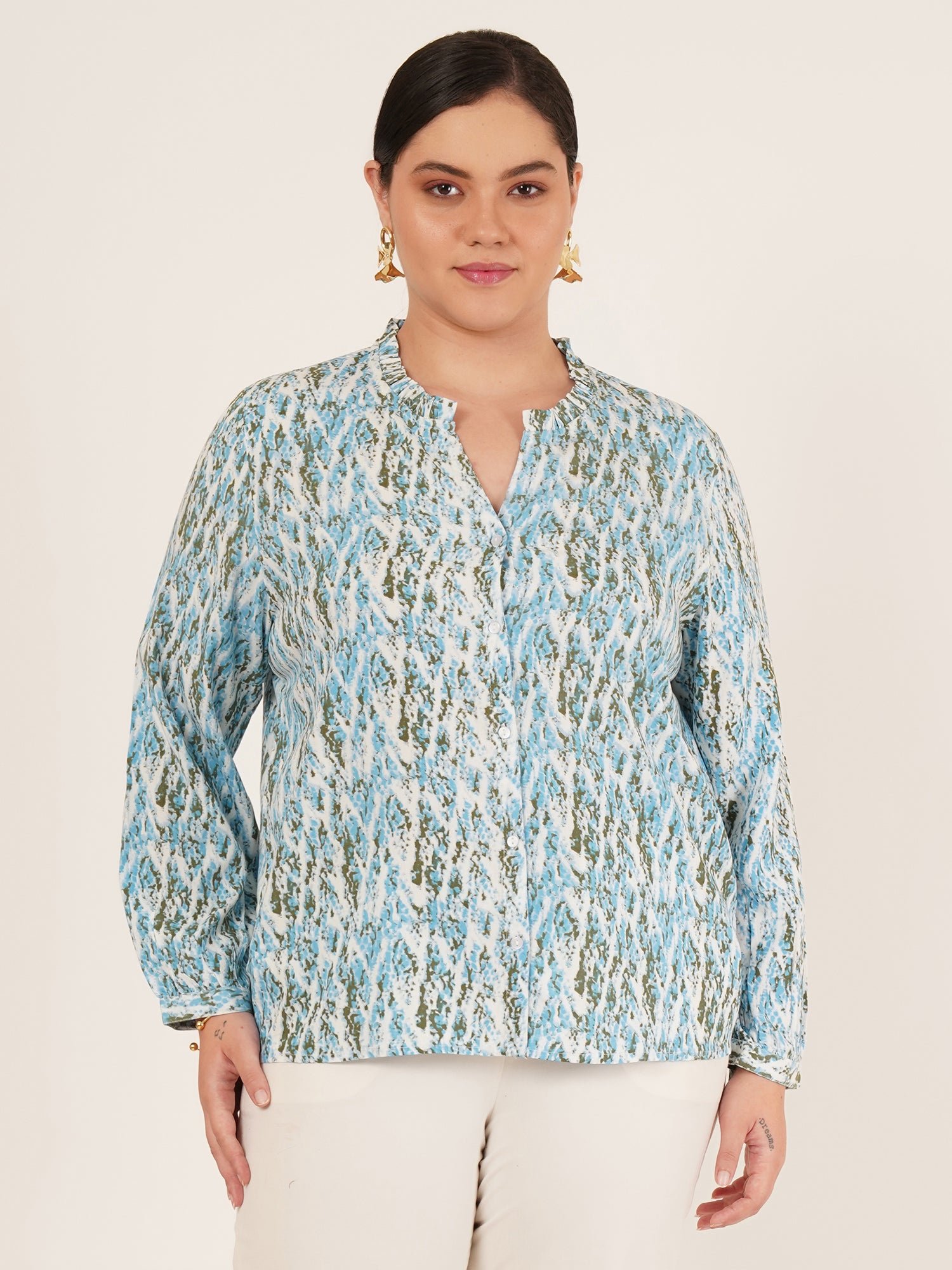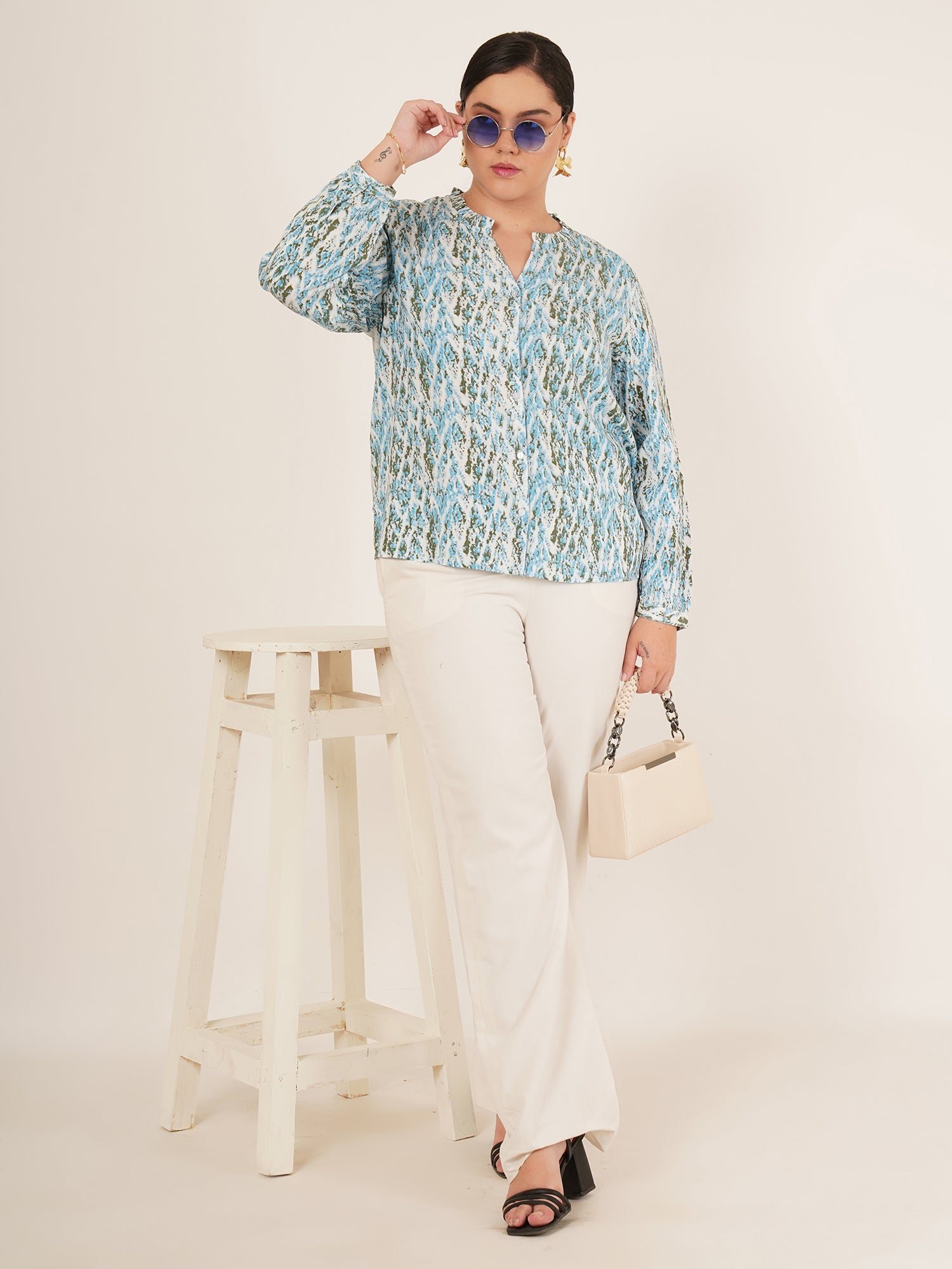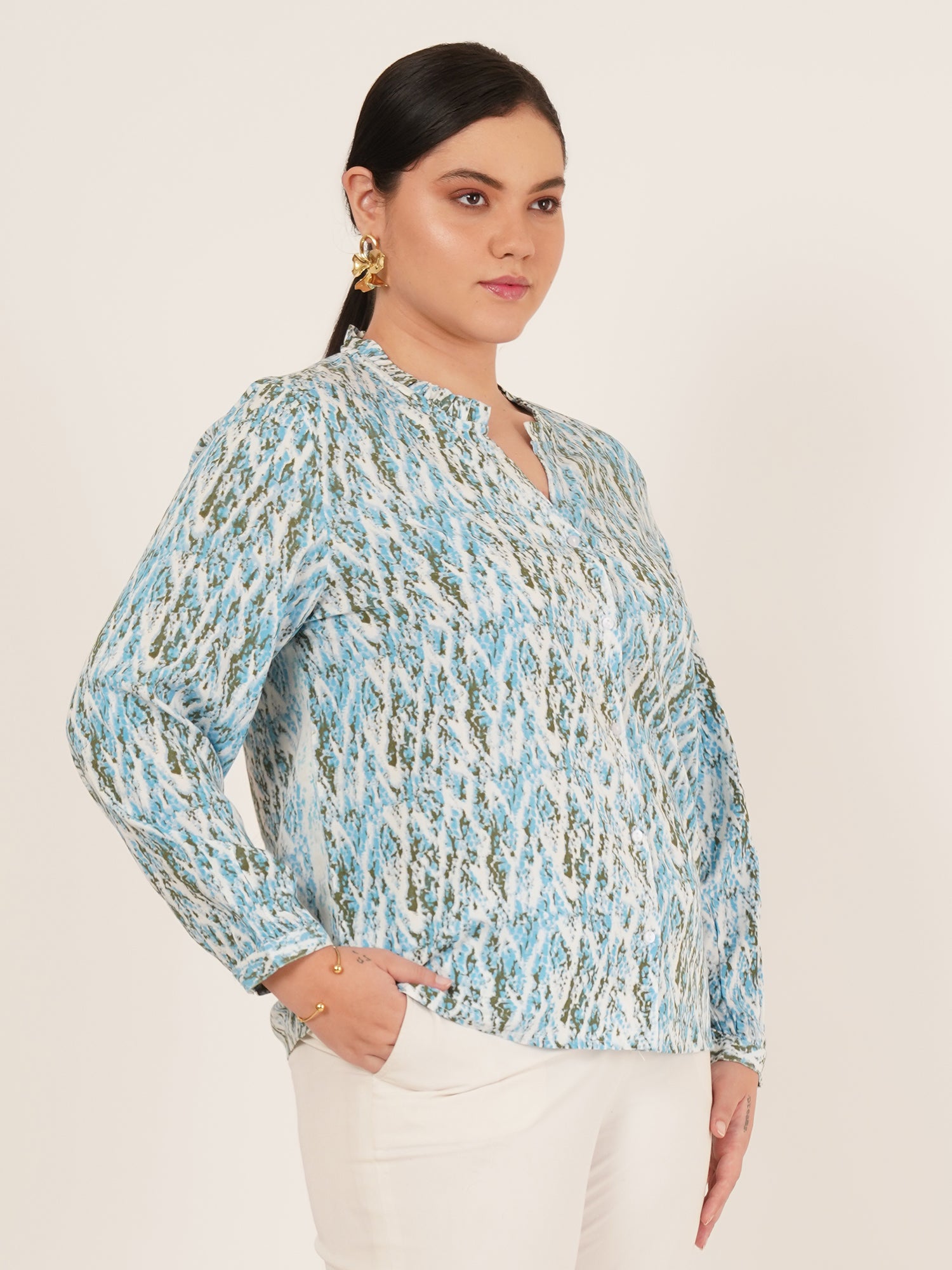 Elevate your everyday style with The Celvane Top from 9 Impression, a perfect fusion of comfort and sophistication. Designed in a soothing light blue and white palette, this plus-size top is crafted from breathable viscose rayon for all-day ease. Featuring a sleek mandarin collar, half-button placket, and a relaxed fit that beautifully drapes over every curve, it transitions effortlessly from office hours to casual outings. A versatile wardrobe essential for the modern woman.