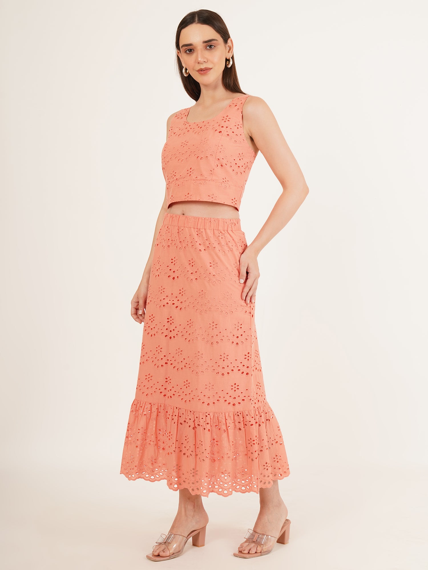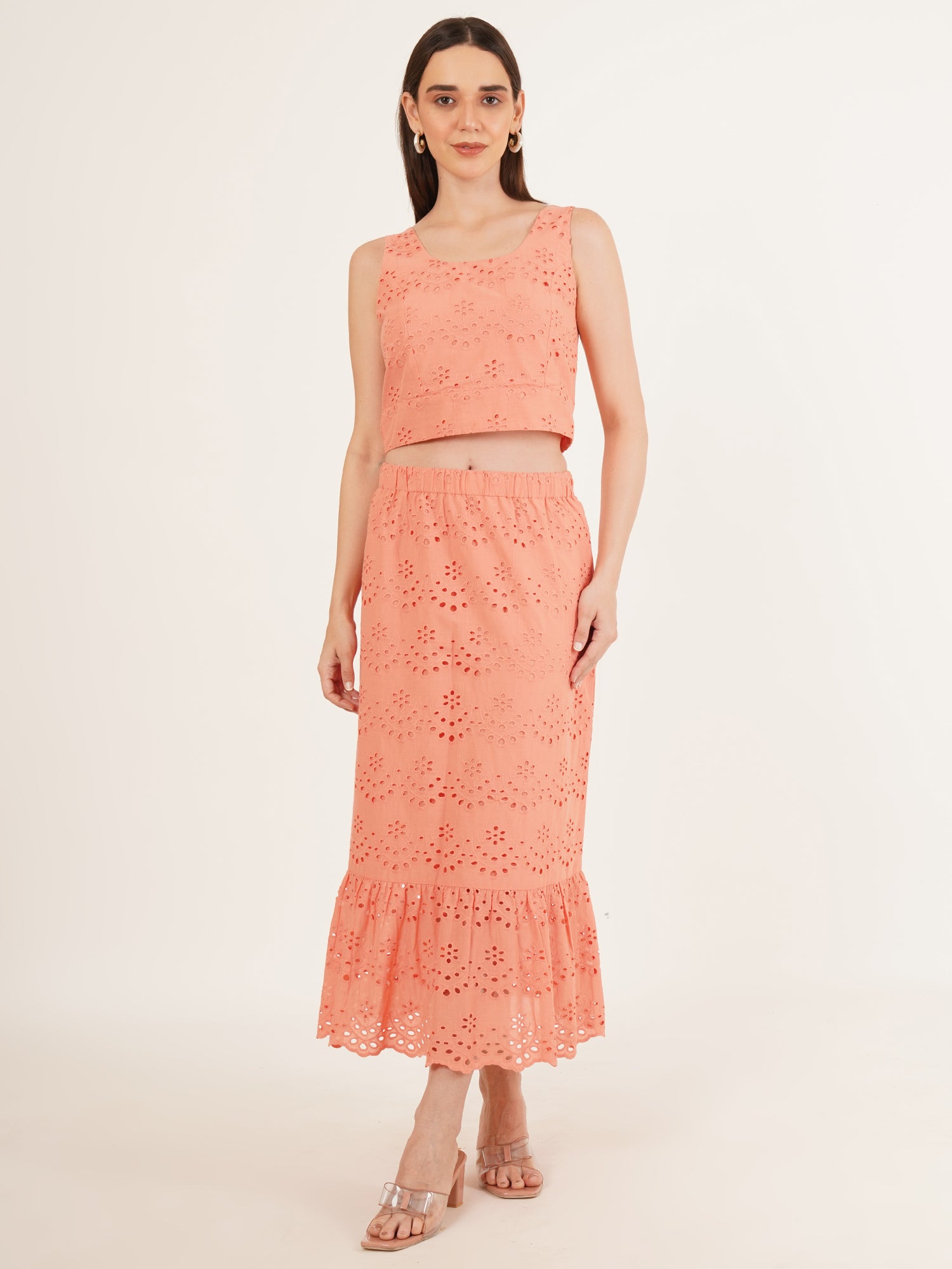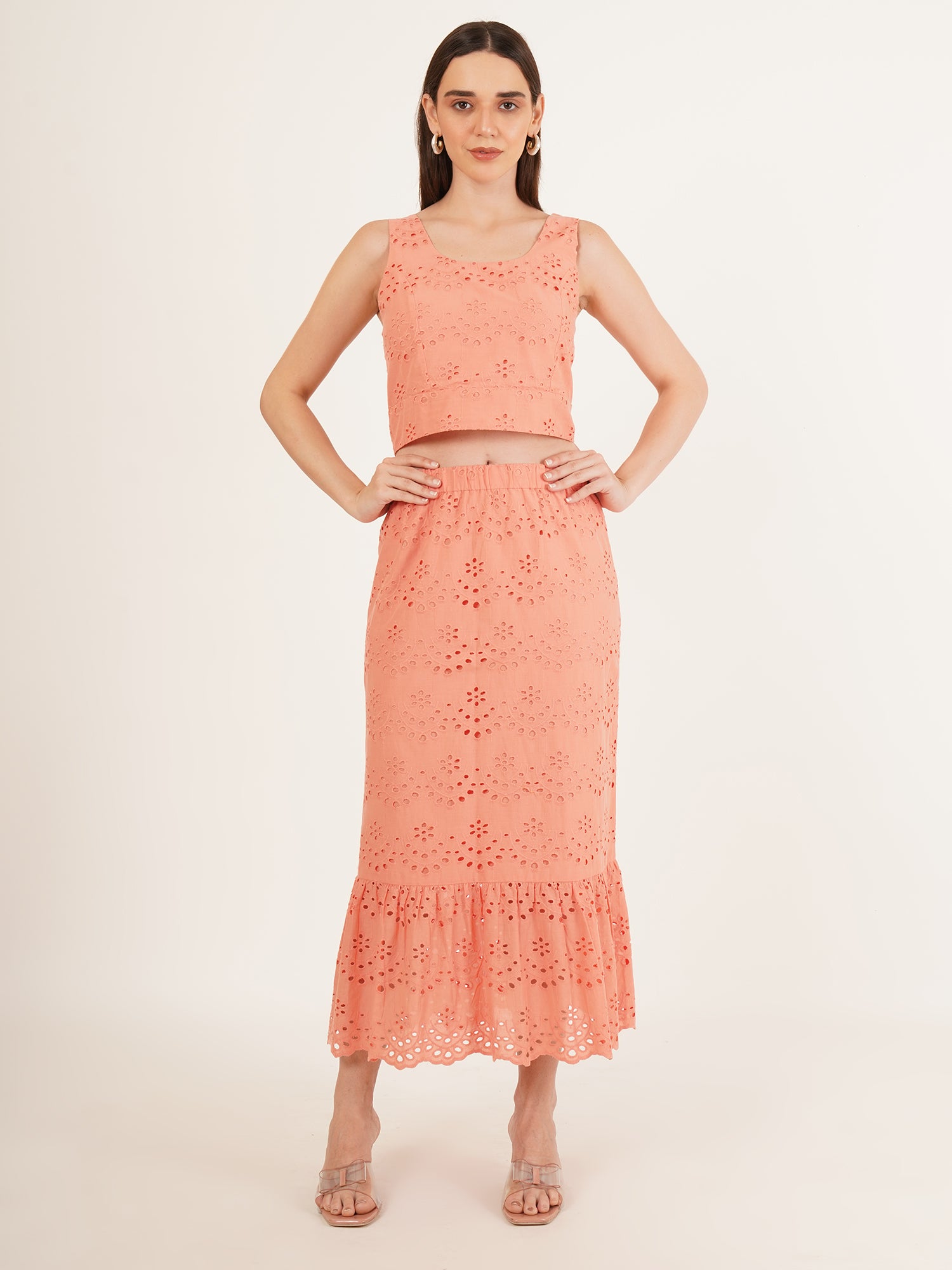 A quiet celebration of summer ease, The Coral Coast Co-Ord Set is crafted from breathable cotton and finished with delicate Schiffli embroidery. The sleeveless top pairs seamlessly with a gently flared midi skirt, both rendered in a soft coral-pink hue that recalls warm light and ocean air. Designed for relaxed elegance, this set moves effortlessly from late brunches to sun-drenched strolls—an invitation to dress with intention, yet without effort.