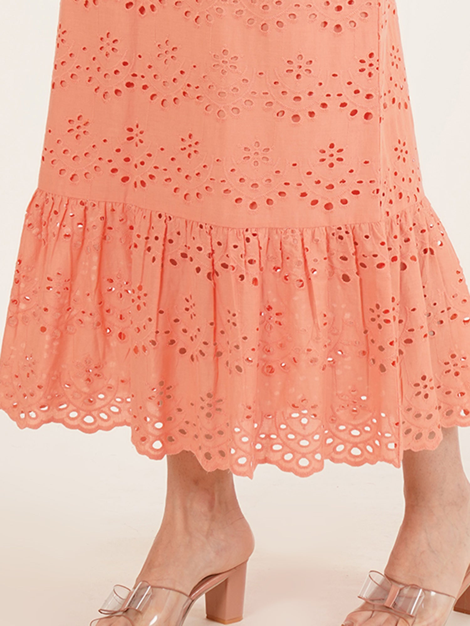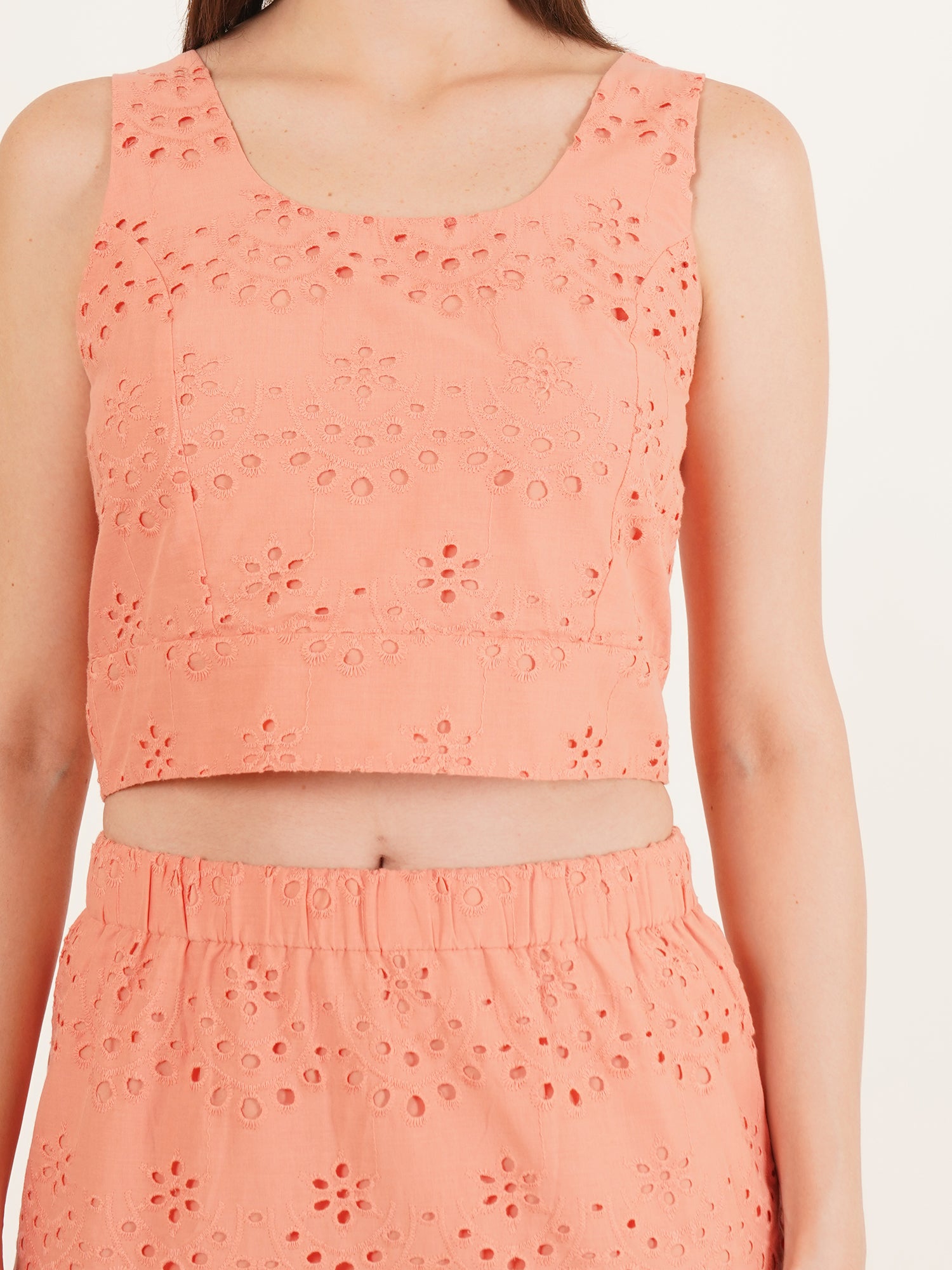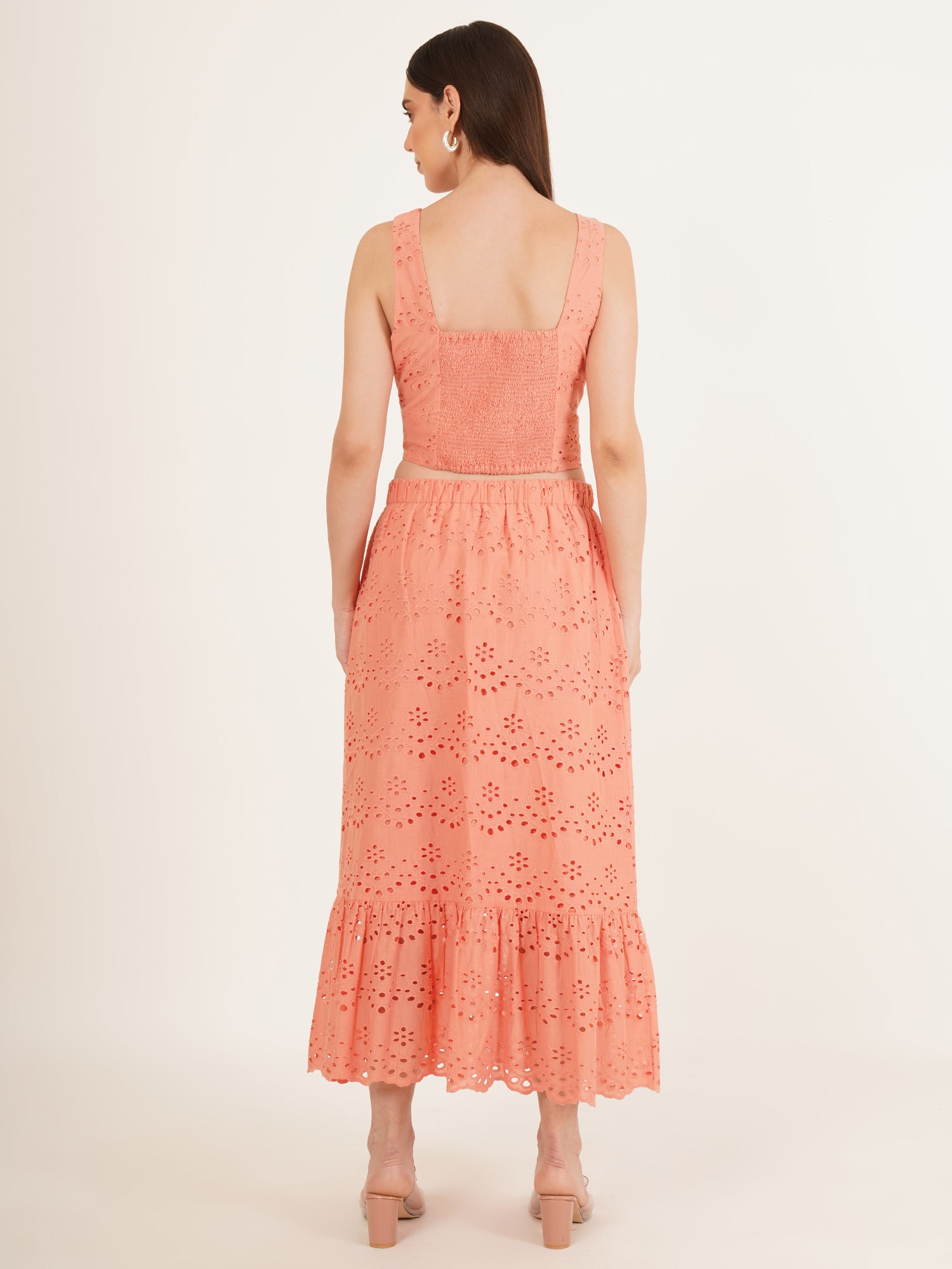 A quiet celebration of summer ease, The Coral Coast Co-Ord Set is crafted from breathable cotton and finished with delicate Schiffli embroidery. The sleeveless top pairs seamlessly with a gently flared midi skirt, both rendered in a soft coral-pink hue that recalls warm light and ocean air. Designed for relaxed elegance, this set moves effortlessly from late brunches to sun-drenched strolls—an invitation to dress with intention, yet without effort.