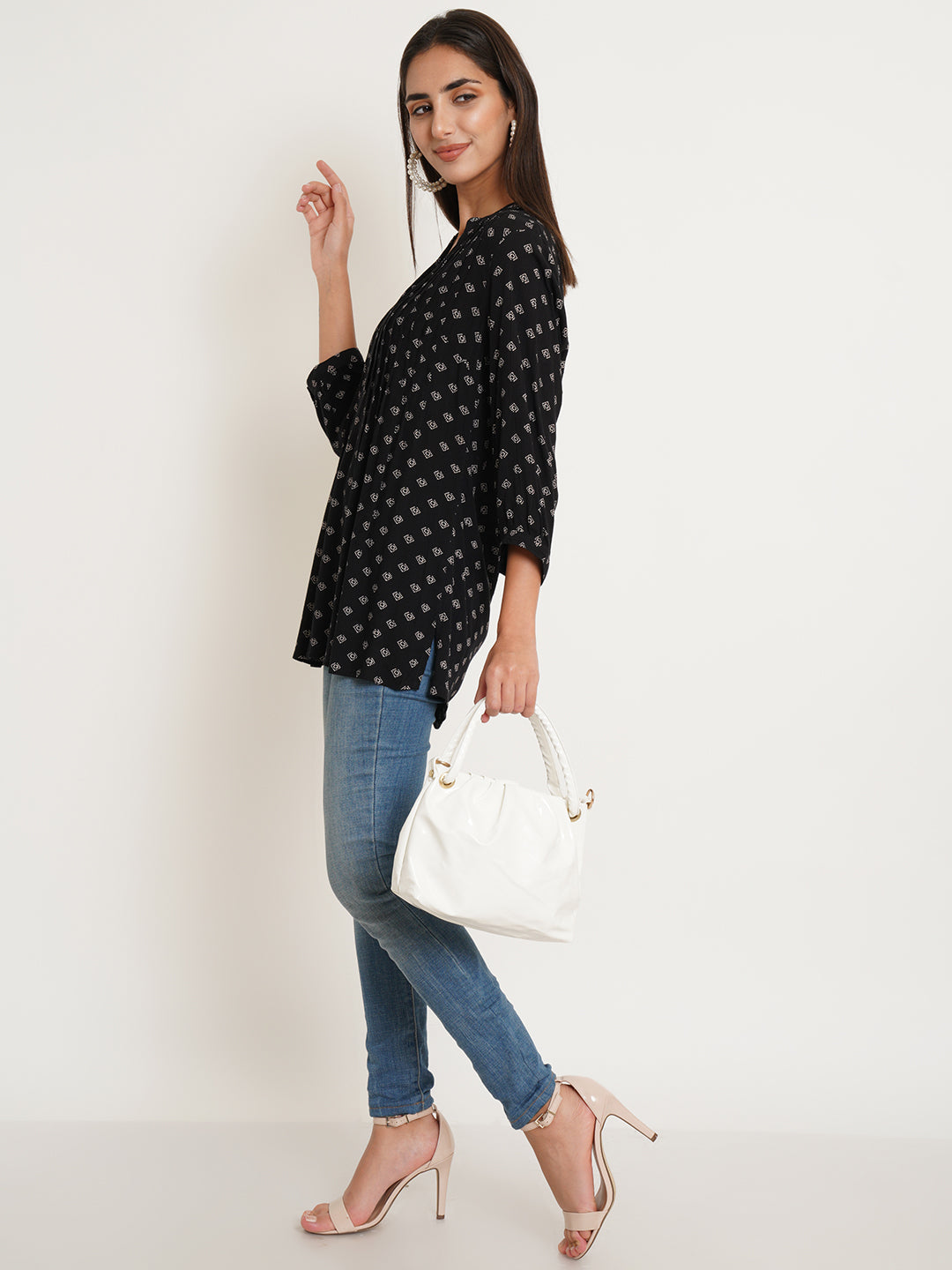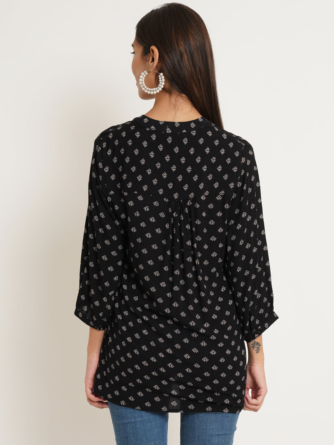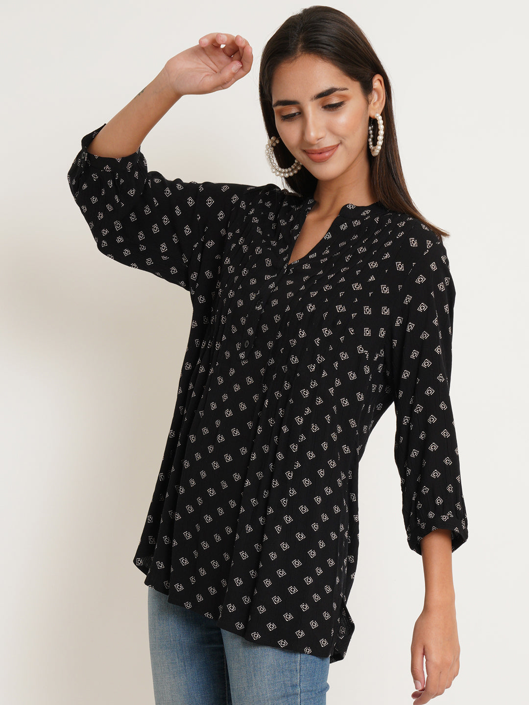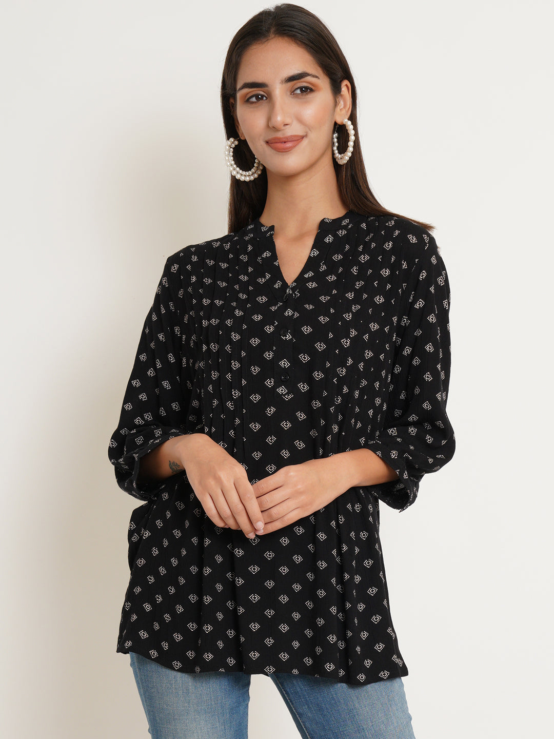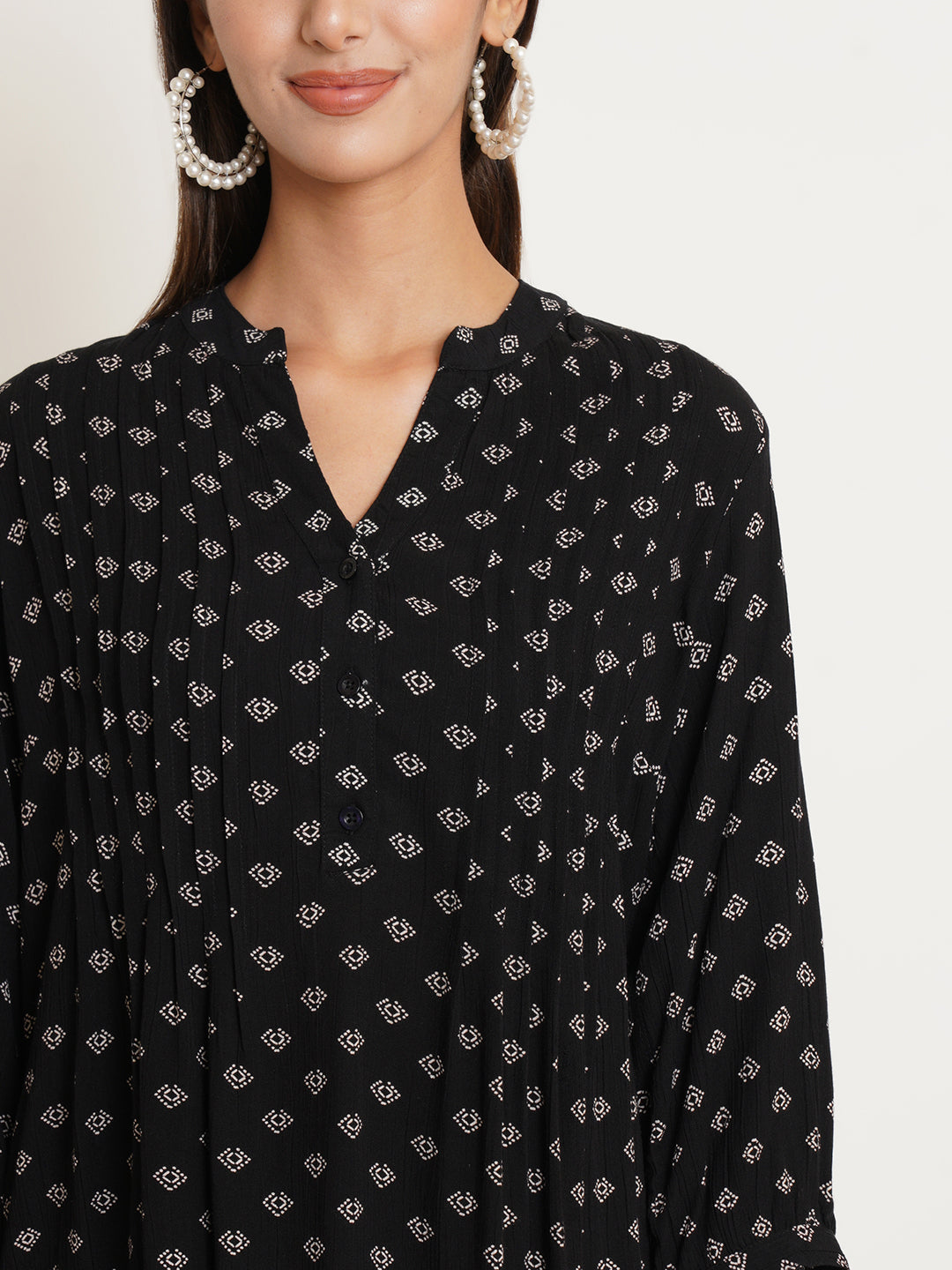 The Diamond Top combines timeless sophistication with modern elegance. Crafted from sleek black fabric adorned with a striking white diamond print, this top brings a subtle yet captivating design to your wardrobe. Pintuck detailing along the front adds texture and refinement, enhancing the flattering fit. Whether dressing up for a casual outing or keeping it laid-back for a more relaxed day, The Diamond Top pairs effortlessly with jeans, skirts, or trousers, making it a versatile piece that transitions seamlessly from day to evening.