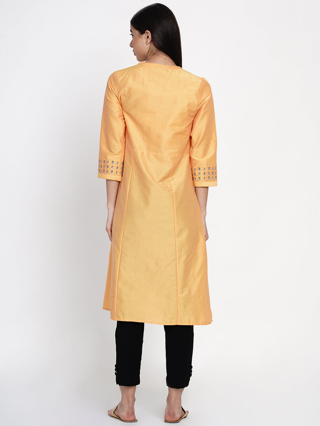 The Elara Kurti exudes graceful charm with its embroidered details and flattering A-line silhouette. Crafted with three-quarter sleeves and a sophisticated mandarin collar featuring a short button placket, it’s a perfect fusion of tradition and contemporary style. Pair it effortlessly with churidars and heels for an elegant, polished look that suits any occasion.