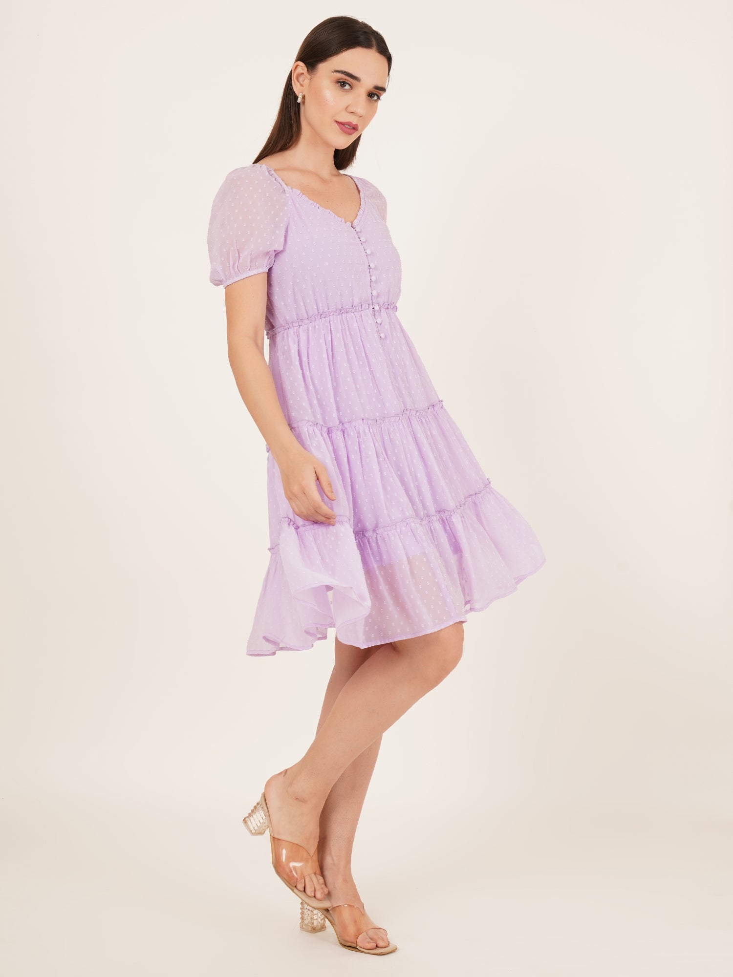 Step into effortless charm with The Lilac Dress. Crafted from soft poly georgette, this lavender-hued dress features a playful dobby print that adds texture and depth to the design. The tiered frill silhouette, paired with sheer short sleeves, creates a feminine and voluminous look, while the poly knit lining ensures comfort throughout the day. Finished with a delicate button-down front and a flattering empire waist, The Lilac Dress is perfect for brunches, picnics, or sunny strolls, offering a stylish yet relaxed vibe.