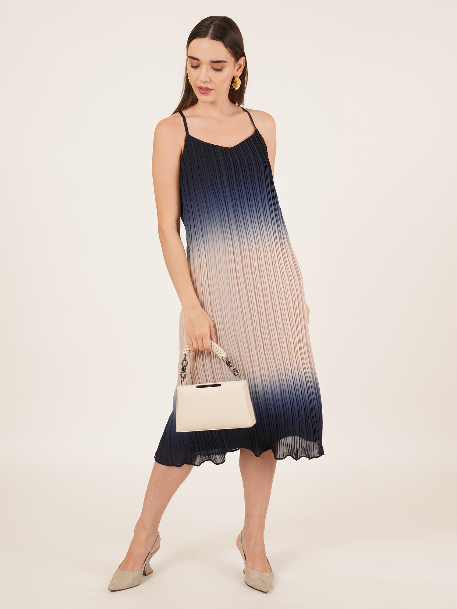 Embrace the beauty of subtle transitions with The Mariselle Dress — an ombre pleated midi dress that flows from soft beige to deep navy blue in an elegant gradient. Crafted from lightweight 100% polyester fabric, this sleeveless dress features delicate shoulder straps and fluid pleats that give it a graceful, airy movement. Perfect for casual brunches, beach vacations, or warm-weather gatherings, The Mariselle adds a touch of modern romance and effortless style to your summer wardrobe.
