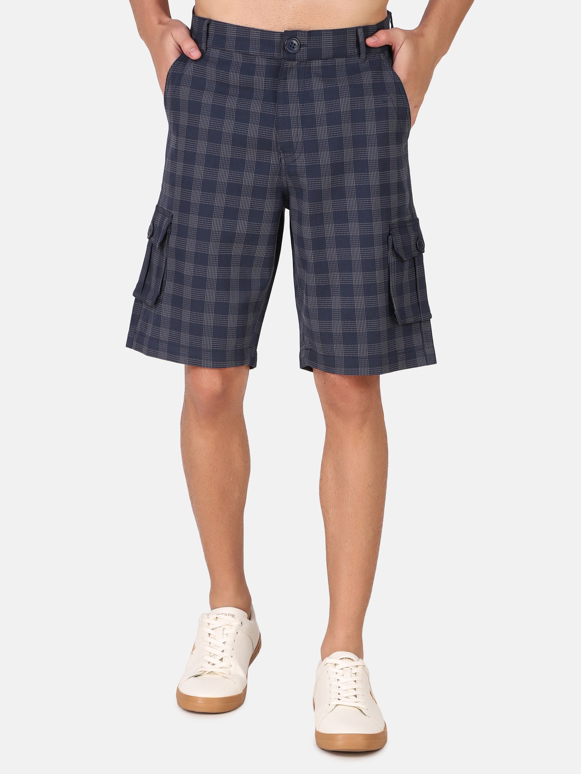 Classic utility meets tailored sophistication in The Navarro Short. Woven from breathable cotton, it features a six-pocket structure with button closure and zip fly for practical ease. The navy blue and soft grey check pattern offers a refined take on heritage menswear, making it equally suited for city weekends or coastal getaways. A modern essential, crafted with intention.