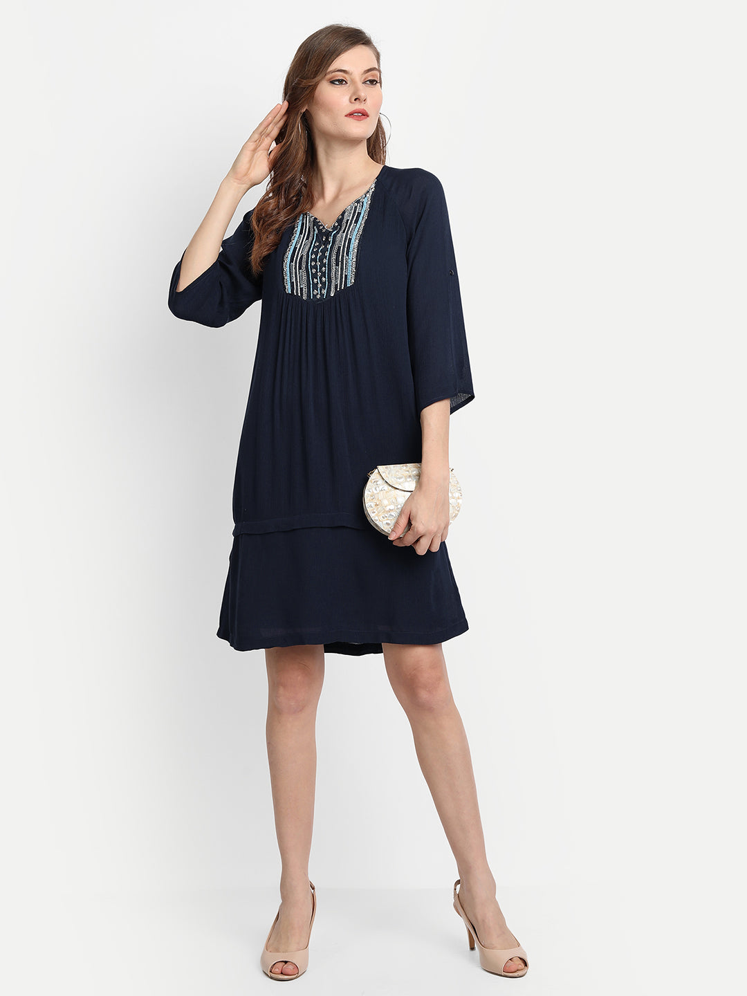 The Navora Dress captures timeless elegance with its deep navy blue hue and delicate front embroidery panel. Designed with a flattering silhouette, this dress transitions effortlessly from casual days to relaxed evenings. Perfect for lunch dates or social gatherings, Navora adds a refined, artisanal touch to your wardrobe.