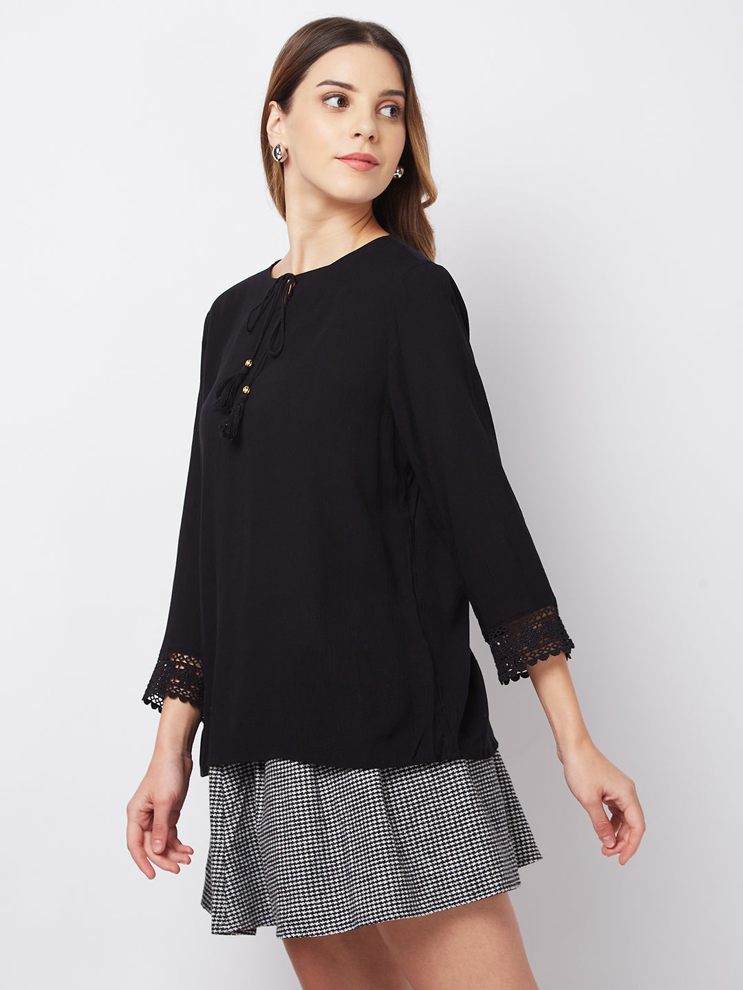 The Nerelle Top embodies quiet sophistication with a subtle hint of allure. Crafted from a fluid, high-quality fabric, it features delicate lace inserts that lend texture and romance to its silhouette. The graceful tie-up neckline offers a refined flourish, perfect for both intimate evenings and elegant daywear. In classic black, Nerelle is a timeless piece—versatile, polished, and endlessly wearable.