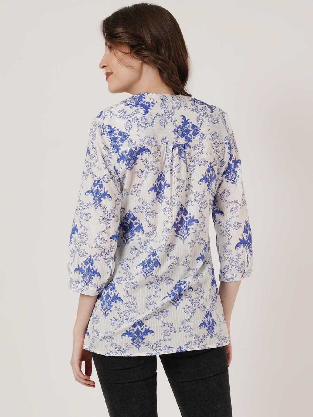 Light and effortlessly refined, The Nivara Kurti blends timeless charm with everyday ease. Crafted in a crisp white base adorned with soft blue floral motifs, it features a mandarin collar, three-quarter sleeves, and a classic button closure. The regular fit flatters without constriction, making it a versatile choice for both daytime polish and relaxed occasions. A quiet statement in comfort and elegance.