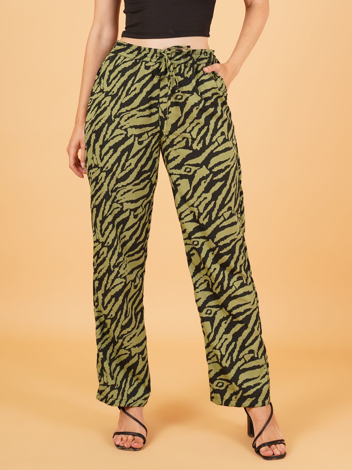 Unapologetically bold and effortlessly luxe, The Nyra Pants fuse wild elegance with everyday ease. Featuring a striking black and green animal print, this regular-fit silhouette is crafted from lightweight polyester to offer fluid comfort with a fashion-forward edge. Designed for those who embrace style in every setting — from laid-back lounging to elevated off-duty dressing — Nyra is where fierce meets refined.