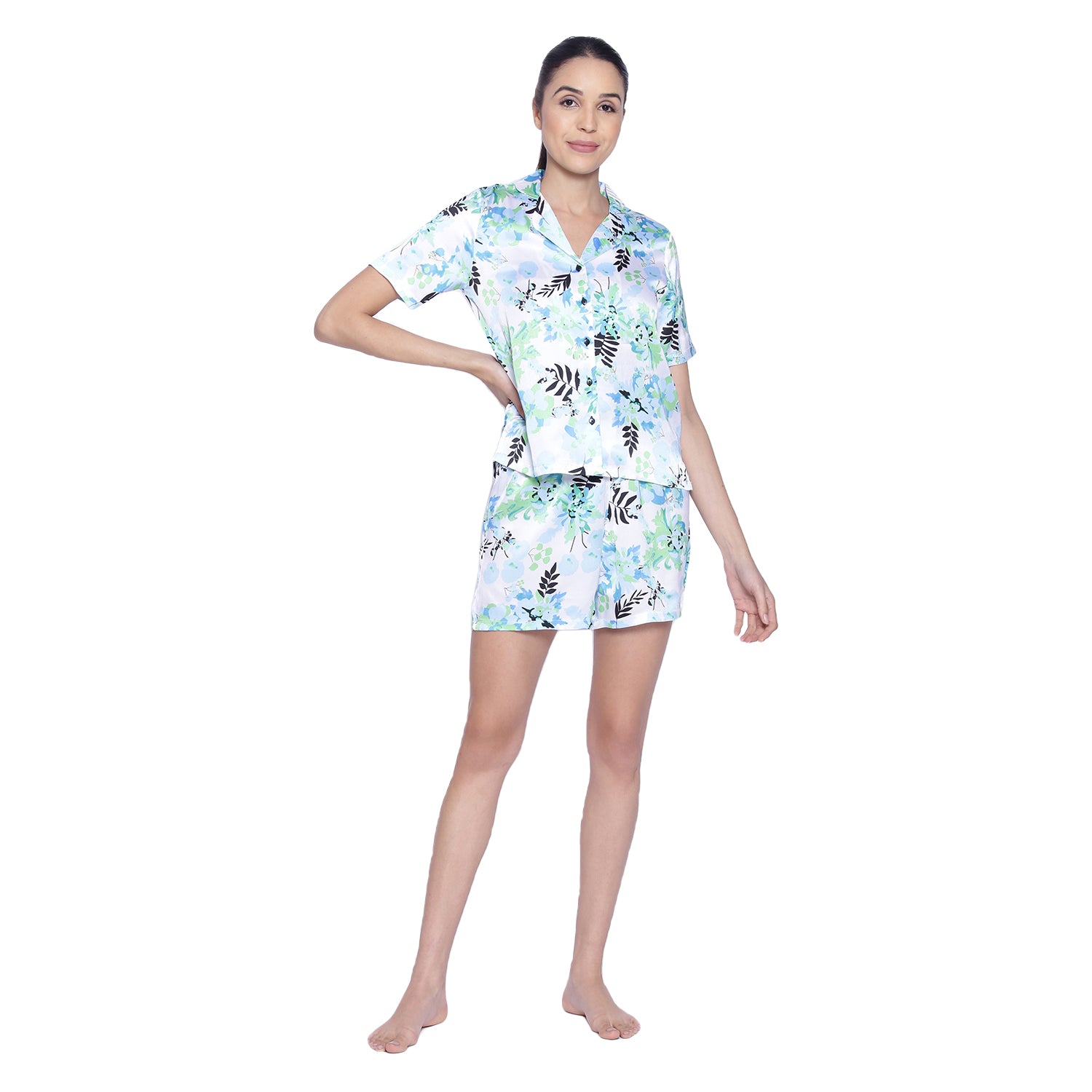 The Nyvara Set brings the beauty of nature to your sleepwear collection with its lush green and white jungle floral print. Made from silky satin, this shorts and shirt set combines luxury and comfort for the perfect lounging experience. The fabric drapes beautifully against your skin, providing a soft, smooth feel. The Nyvara Set is perfect for those who seek both style and comfort in their sleepwear, while also adding a touch of floral elegance to their wardrobe.