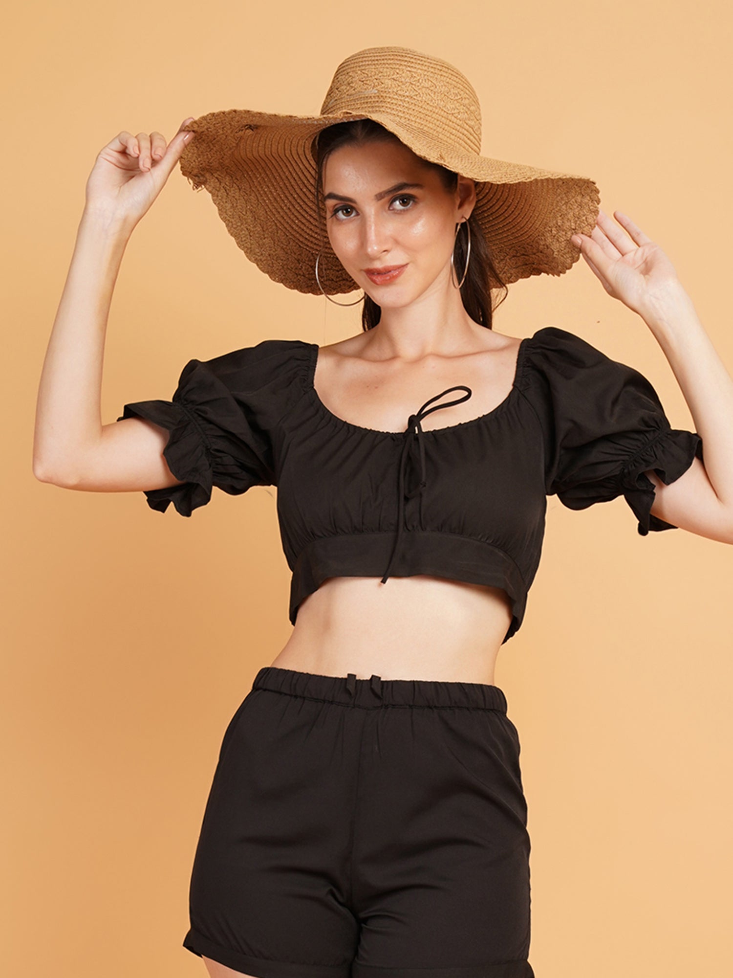The Ravvera Top is expertly crafted for the modern woman who seeks both elegance and versatility. With its dramatic puff sleeves and adjustable drawstring detailing, this black crop top brings a touch of sophisticated flair to any outfit. The design offers a flattering fit that can be customized to your liking, making it a perfect choice for any occasion. Whether dressed up for a night out or paired with casual jeans, The Ravvera Top is a must-have wardrobe essential for the fashion-forward.