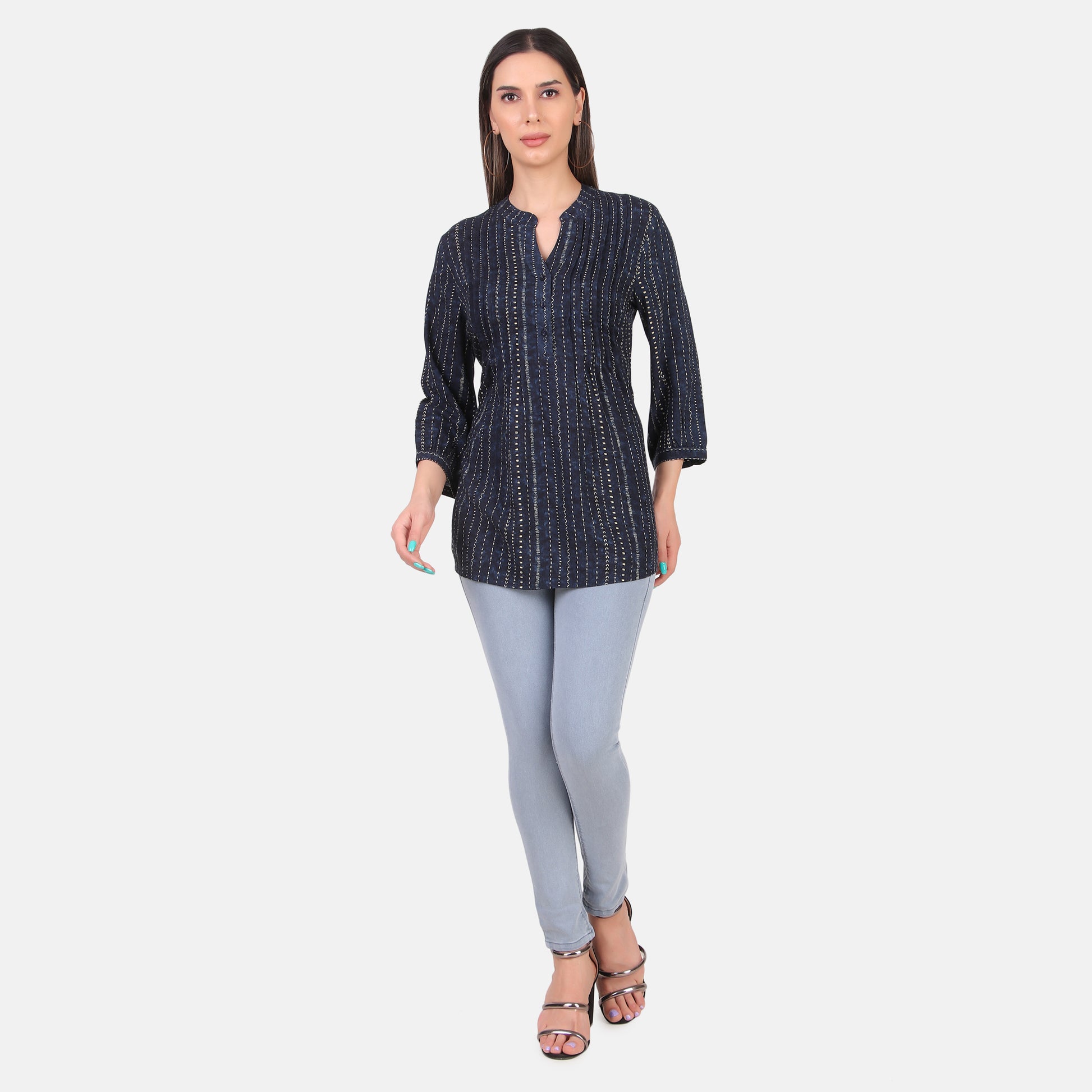 The Renelle Top is the perfect combination of comfort and style. Crafted with intricate pintuck detailing on the front, this top brings a touch of texture and visual appeal to your everyday wardrobe. The three-quarter cuffed sleeves elevate the look, adding sophistication and elegance to a relaxed silhouette. Designed with a loose fit, it offers ease of movement and a flattering shape that falls below the hips. Ideal for both casual and semi-casual outings, this lightweight tunic is crafted from soft fabric to ensure comfort all day long. Whether you're dressing it up for a lunch date or pairing it with jeans for a laid-back look, The Renelle Top is a versatile wardrobe essential.
