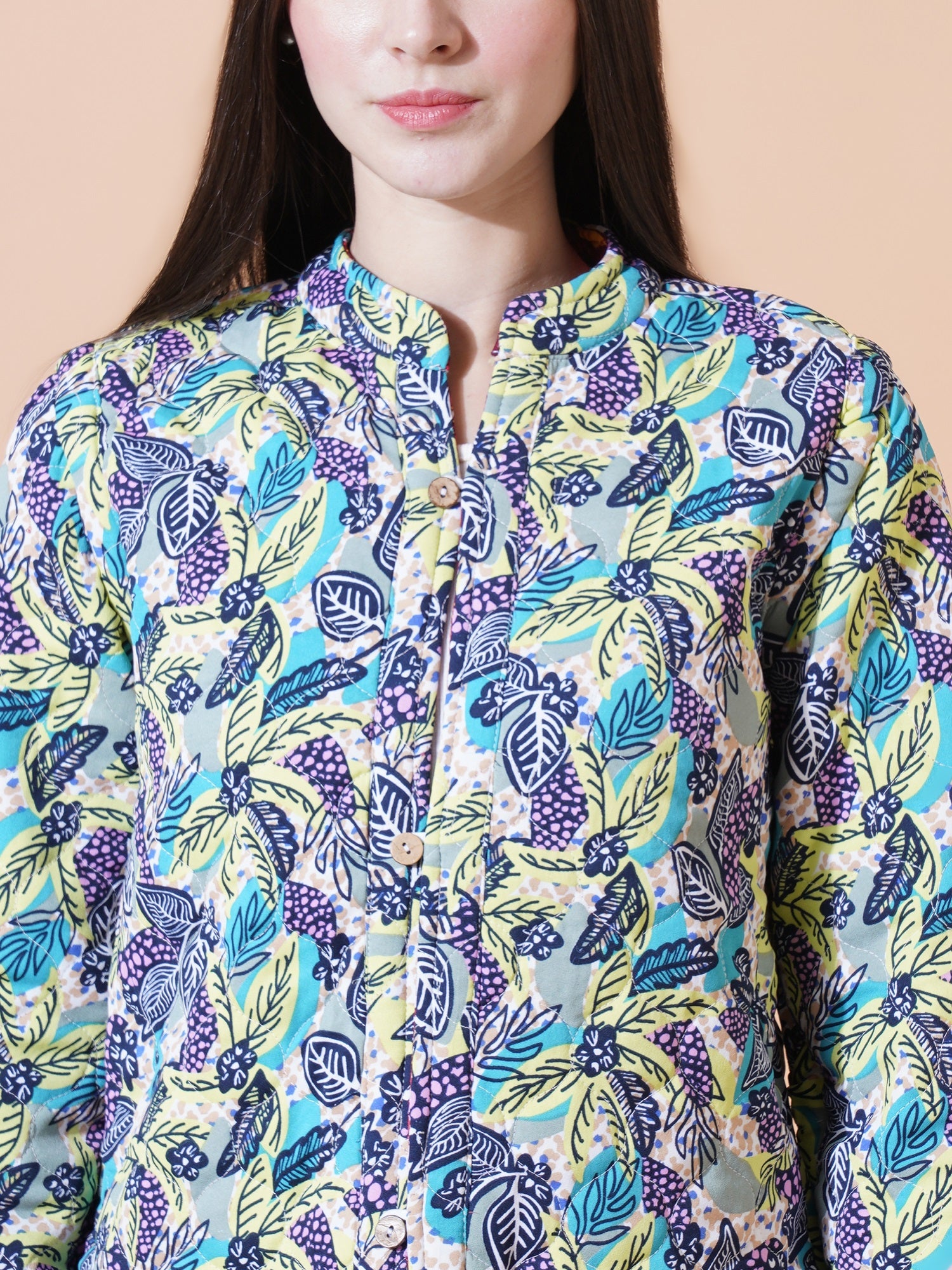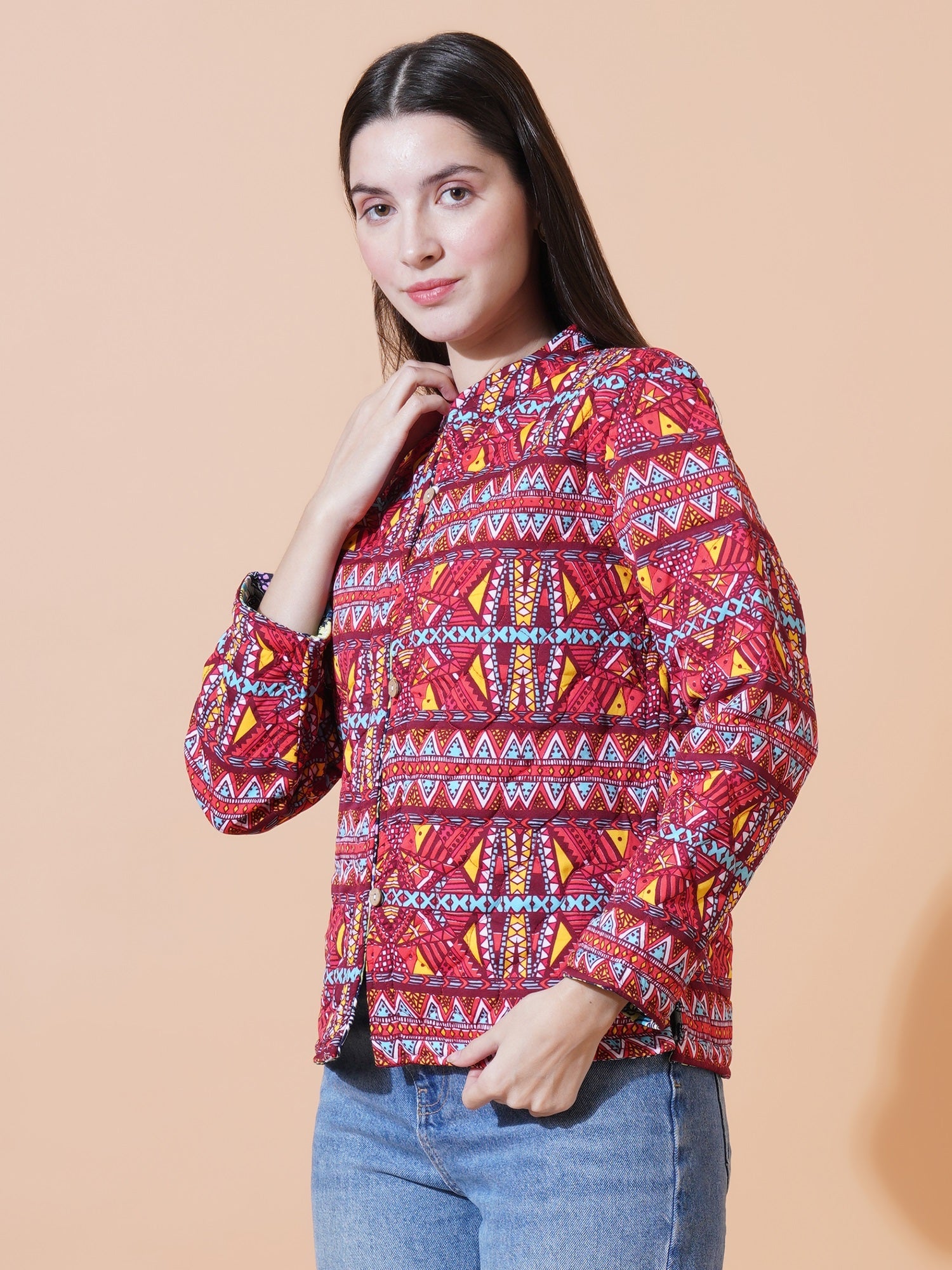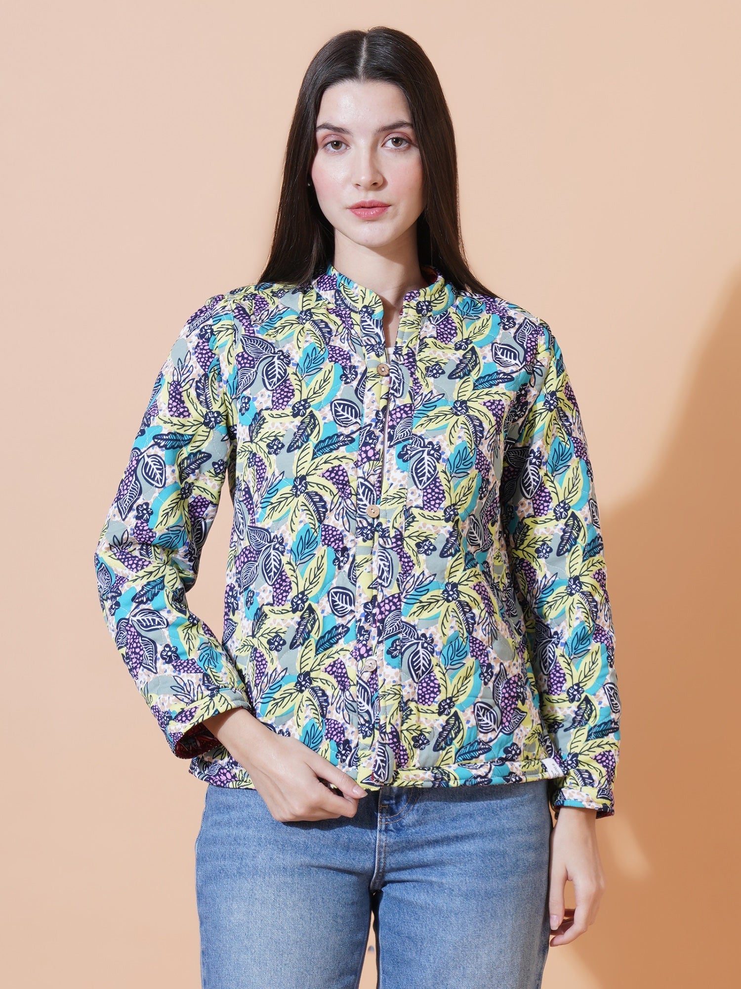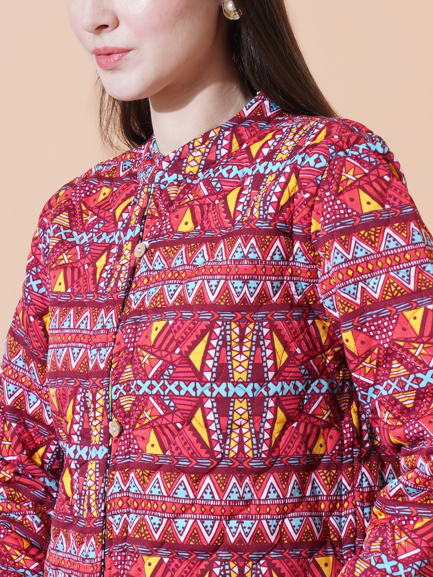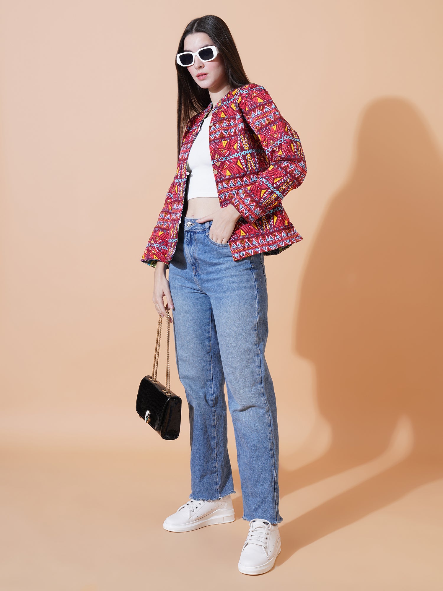 Two expressions, one refined silhouette—The Reveri Jacket is a reversible design that effortlessly balances artistry and elegance. Crafted from a soft blend of cotton and polyester, it features a richly hued maroon side and a contrasting green botanical print on the reverse. A mock collar and distinctive button closure lend structure, while the lightweight feel ensures comfort across seasons. An adaptable layer designed for thoughtful transitions and timeless style.
