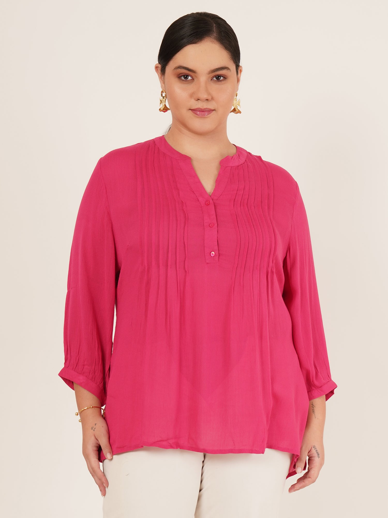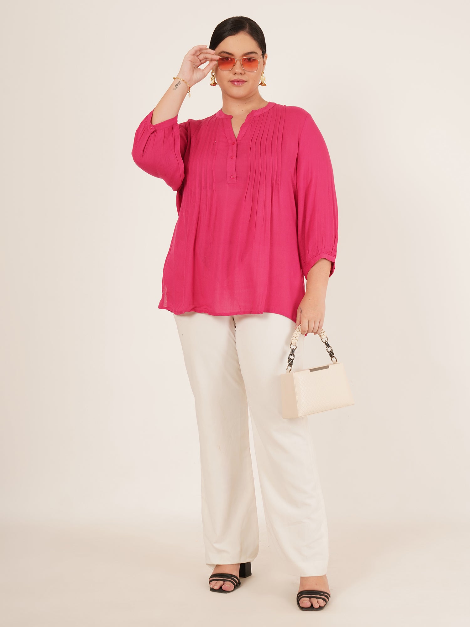 Add a pop of bold elegance to your wardrobe with The Rosava Top from 9 Impression. Crafted from soft, breathable viscose rayon in a vibrant pink hue, this plus-size top features delicate pintuck detailing along the front, a chic mandarin collar, and a half-button placket. Designed with a relaxed silhouette and three-quarter sleeves, it offers a flattering fit without compromising on comfort. Perfect for brightening up your office attire or adding effortless charm to everyday looks.