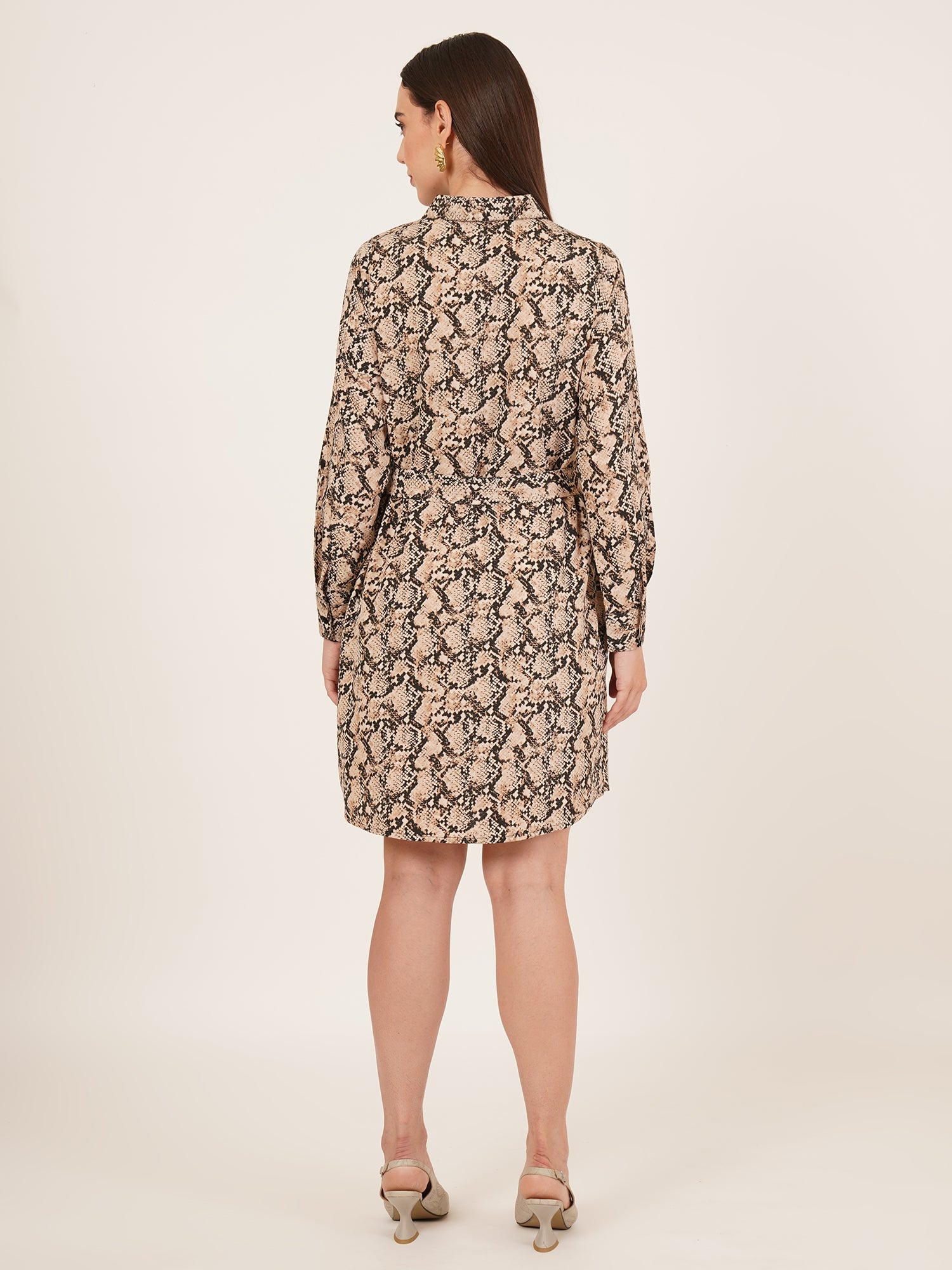 Make a statement of refined confidence with The Seraphina Dress — an exquisite snake print mini dress that combines timeless sophistication with a touch of the exotic. Crafted from premium poly crepe fabric, this dress features a classic shirt-style silhouette, complete with a polished collar, full sleeves with buttoned cuffs, and a sleek front button closure. The fabric belt cinches the waist, creating a flattering, tailored fit that exudes elegance. Whether worn for an upscale brunch, an evening out, or an exclusive gathering, The Seraphina Dress offers a seamless blend of modern luxury and effortless glamour.