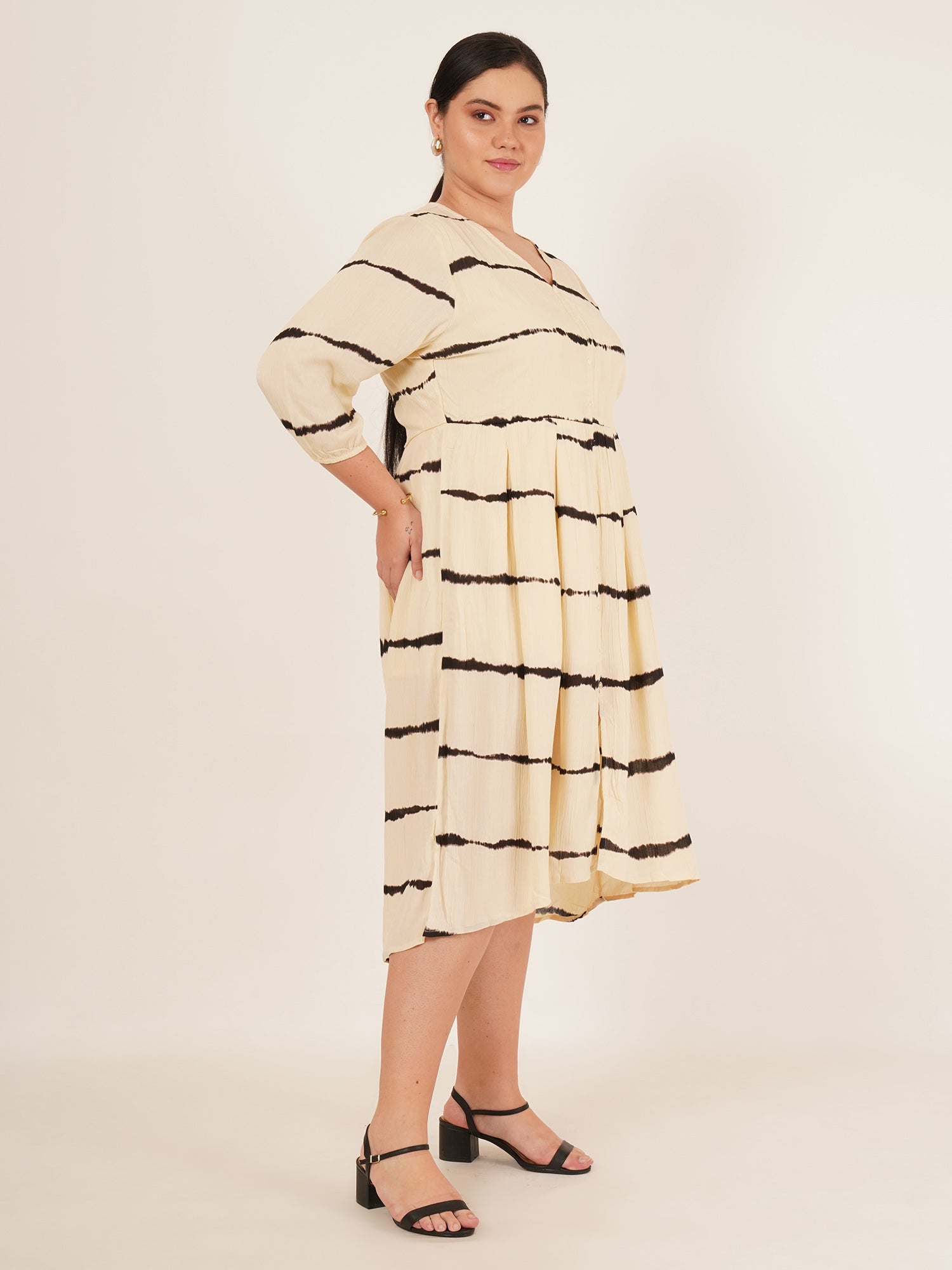 Step into effortless style with this stunning beige and black tie-dye midi dress from 9 Impression, tailored for plus-size women. Crafted in a soft, breathable fabric, this dress features a flattering V-neckline, 3/4th sleeves, and a front button-down design that leads to a chic slit for added movement and flair. Perfect for casual brunches, weekend getaways, or everyday comfort with style.