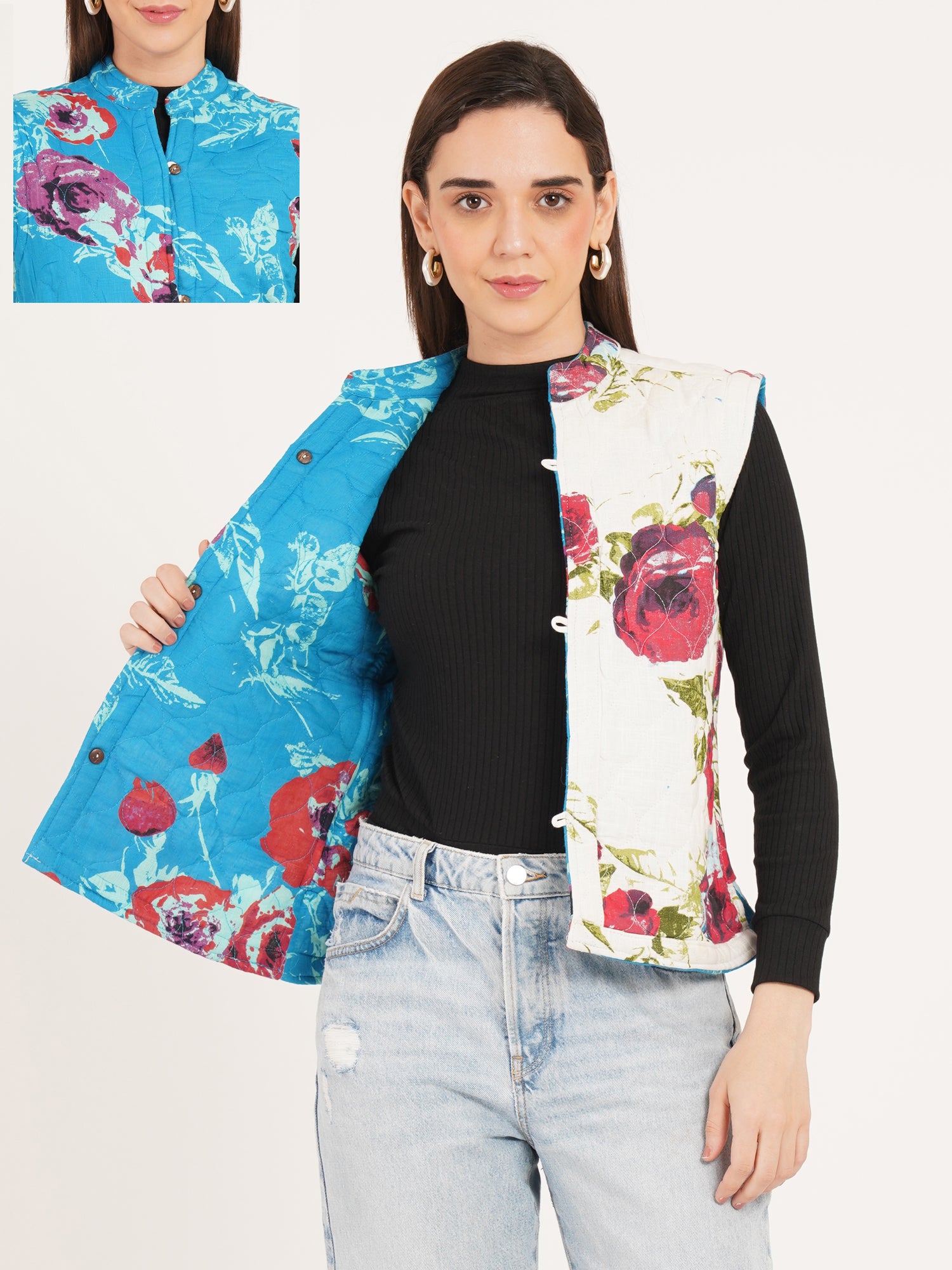 Refresh your winter style with this elegant floral printed sleeveless Nehru jacket from IX IMPRESSION. Crafted with fine quilting for lightweight warmth, it combines classic charm with modern flair. The Nehru collar and front button closure give it a refined touch, while the floral print adds a feminine edge. Perfect for layering over kurtas, tops, or dresses, this versatile piece keeps you cozy and stylish throughout the season.