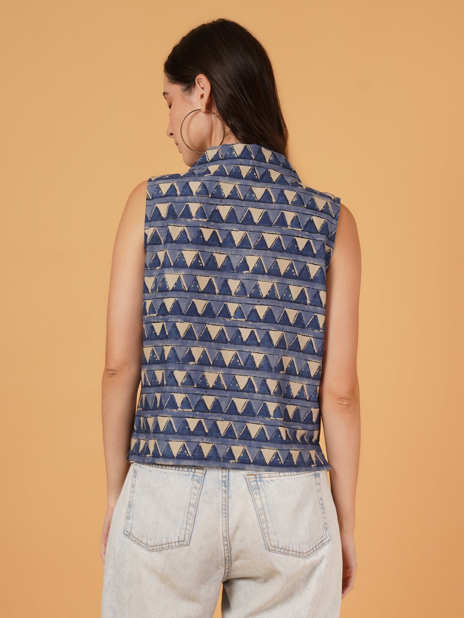 This elegant crop top features a unique geometric print in navy blue and beige, making it a stylish addition to any wardrobe. The lapel collar and perfectly tailored sleeves add a touch of sophistication. Perfect for a day at the office or a night out, this top offers both comfort and style.