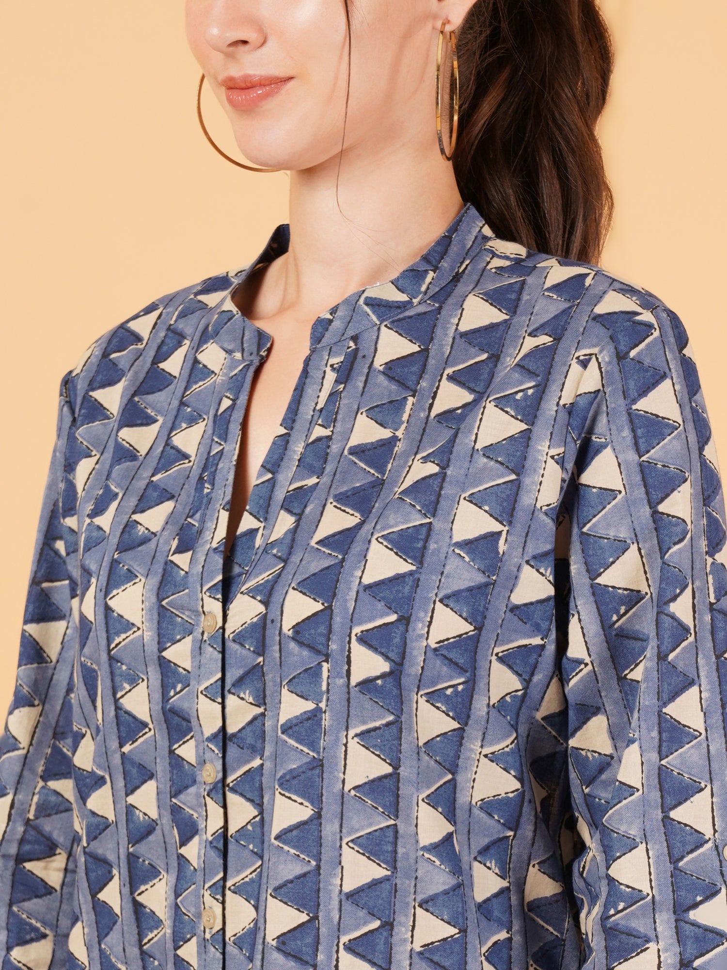 Expertly designed and crafted, our Women Navy Blue & Beige Geometry Print Shirt is made with 100% cotton fabric for a comfortable and stylish fit. Featuring a unique geometry print in navy blue and beige, this shirt offers a 9-point impression for a sophisticated and chic look. Elevate your wardrobe with this must-have piece.