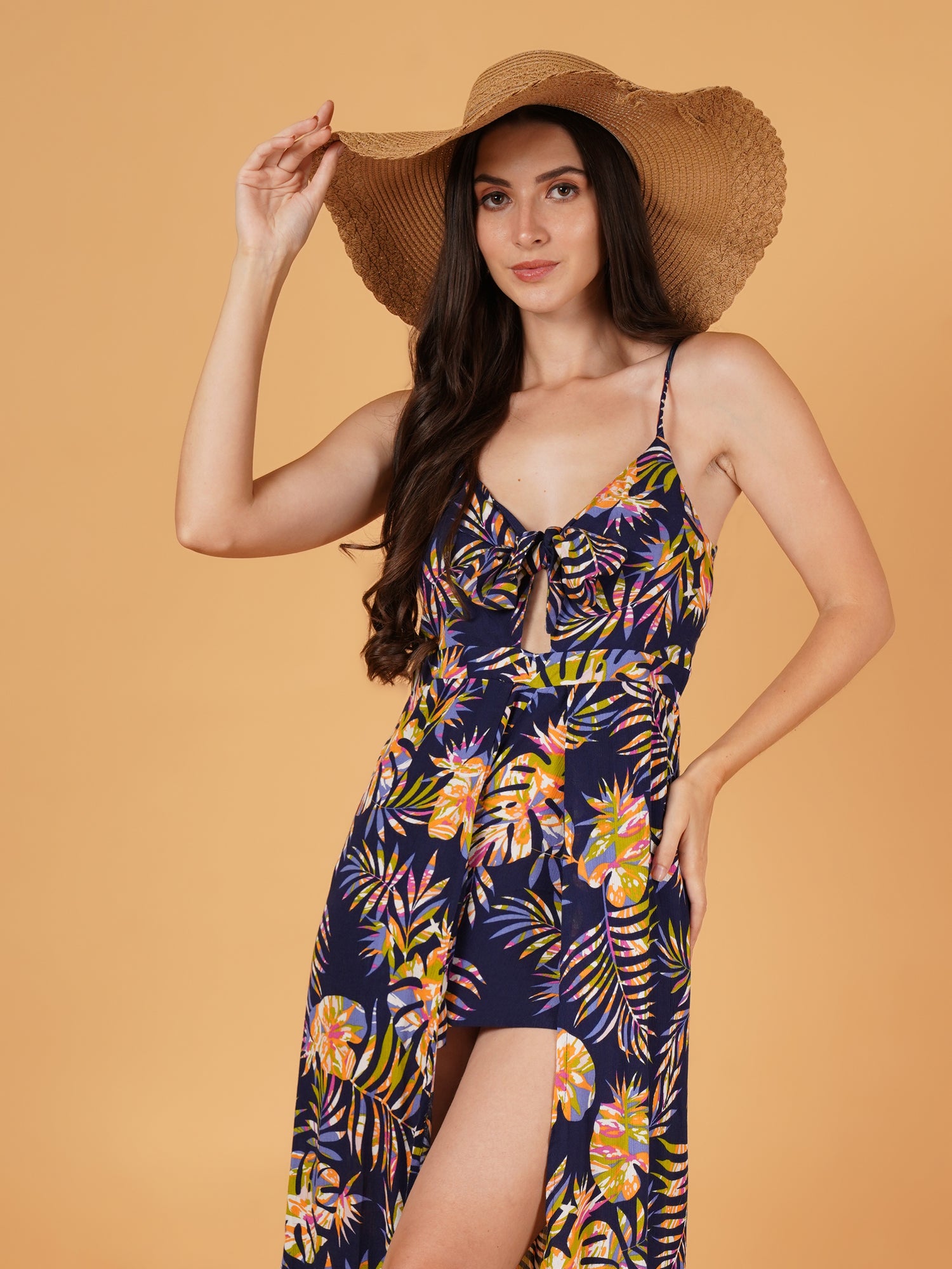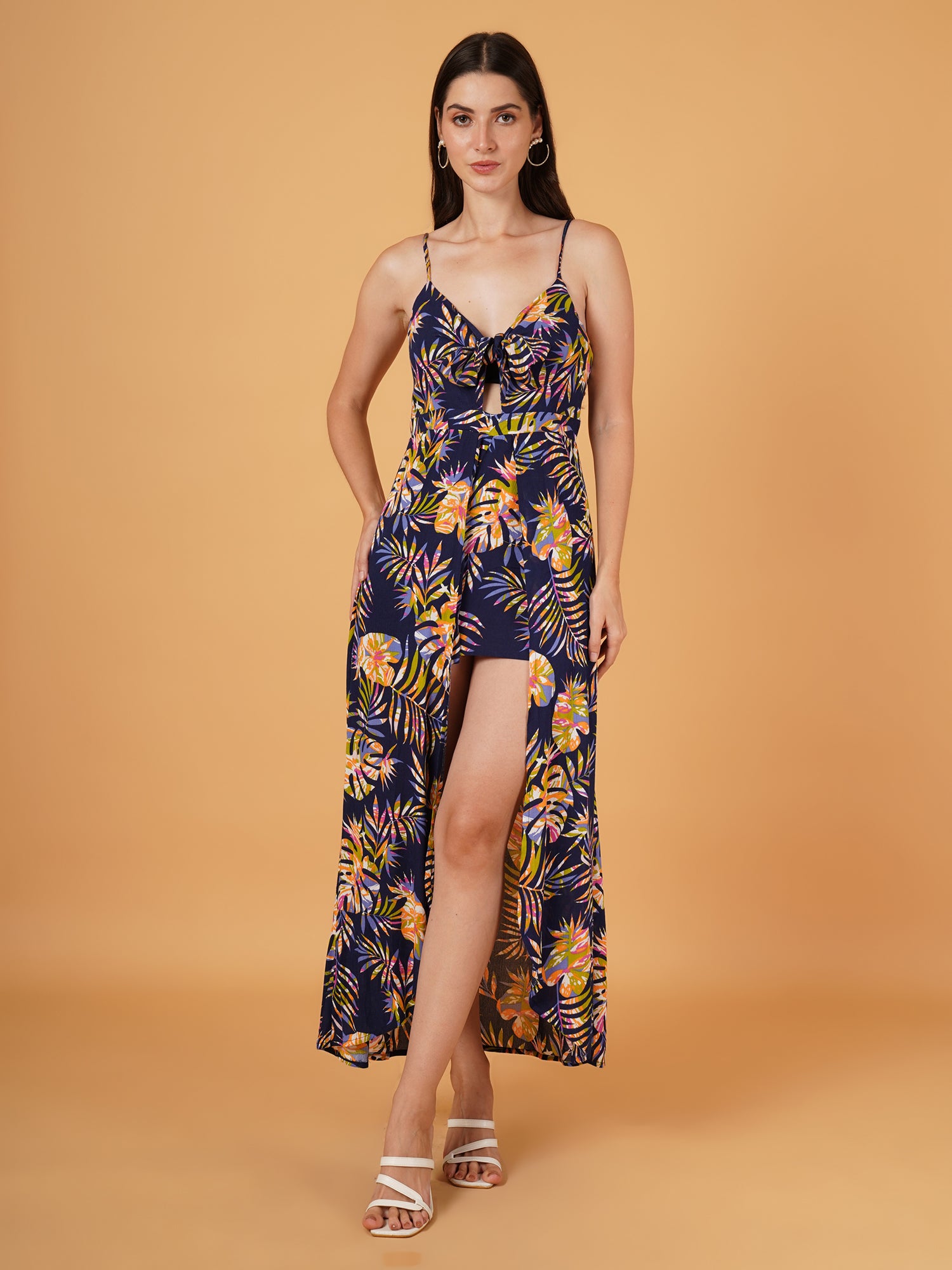 Women Navy Blue & Green Leaf Print Jumpsuit