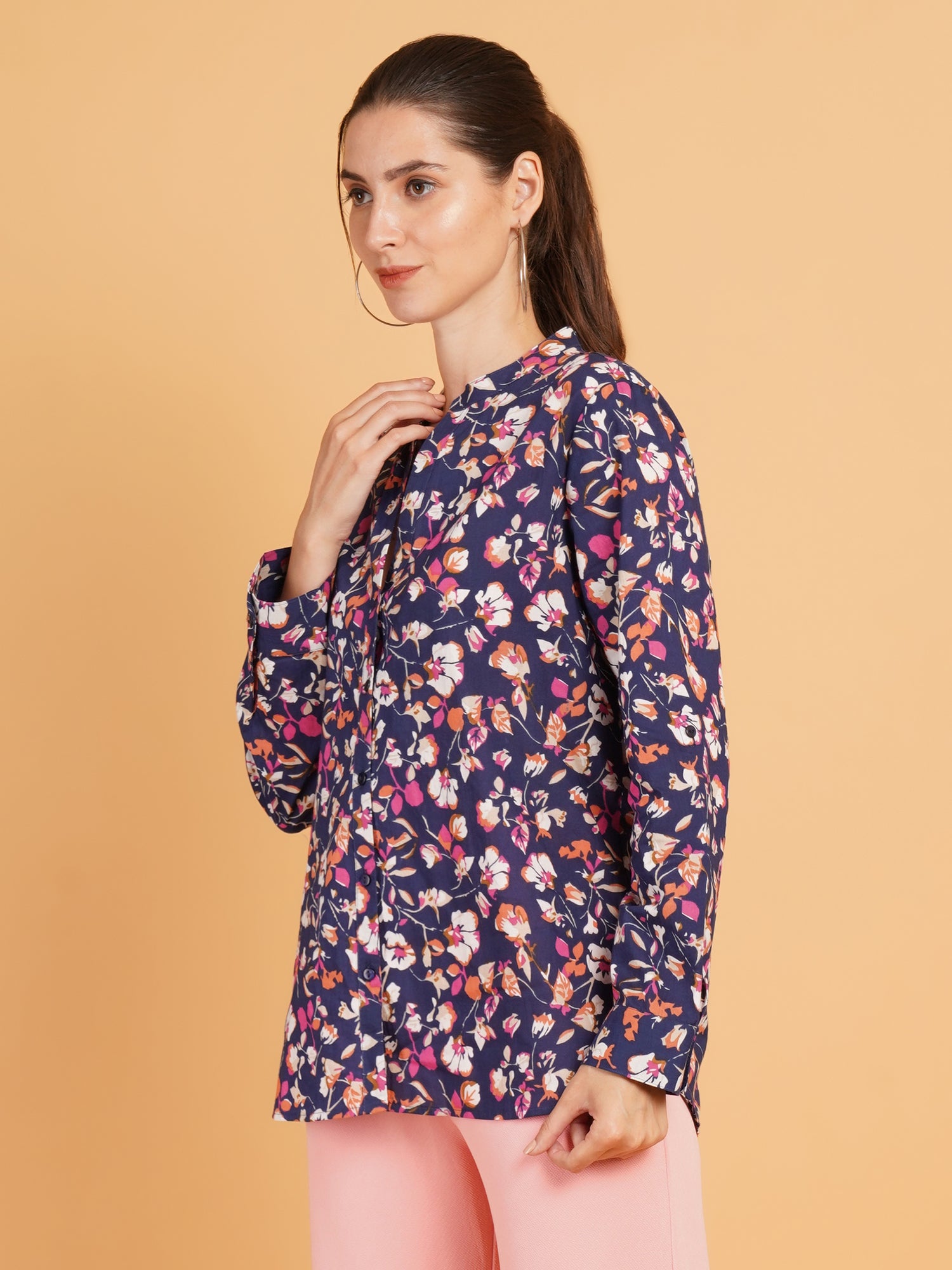 Women Navy Blue & Pink Floral Print Mandarin Collar Cotton Shirt