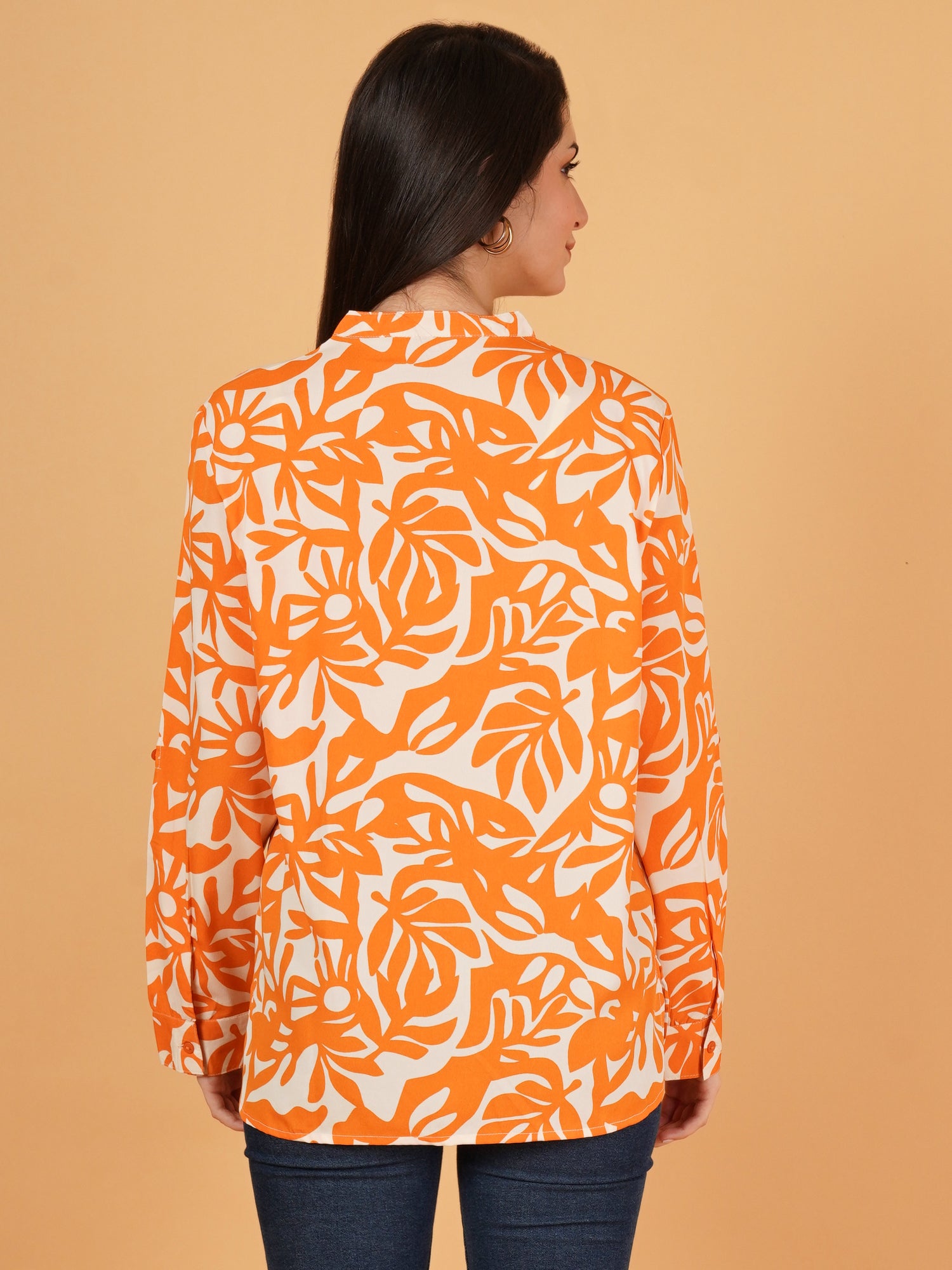 Women Orange & White Mandarin Collar Cotton Oversized Shirt Style Top