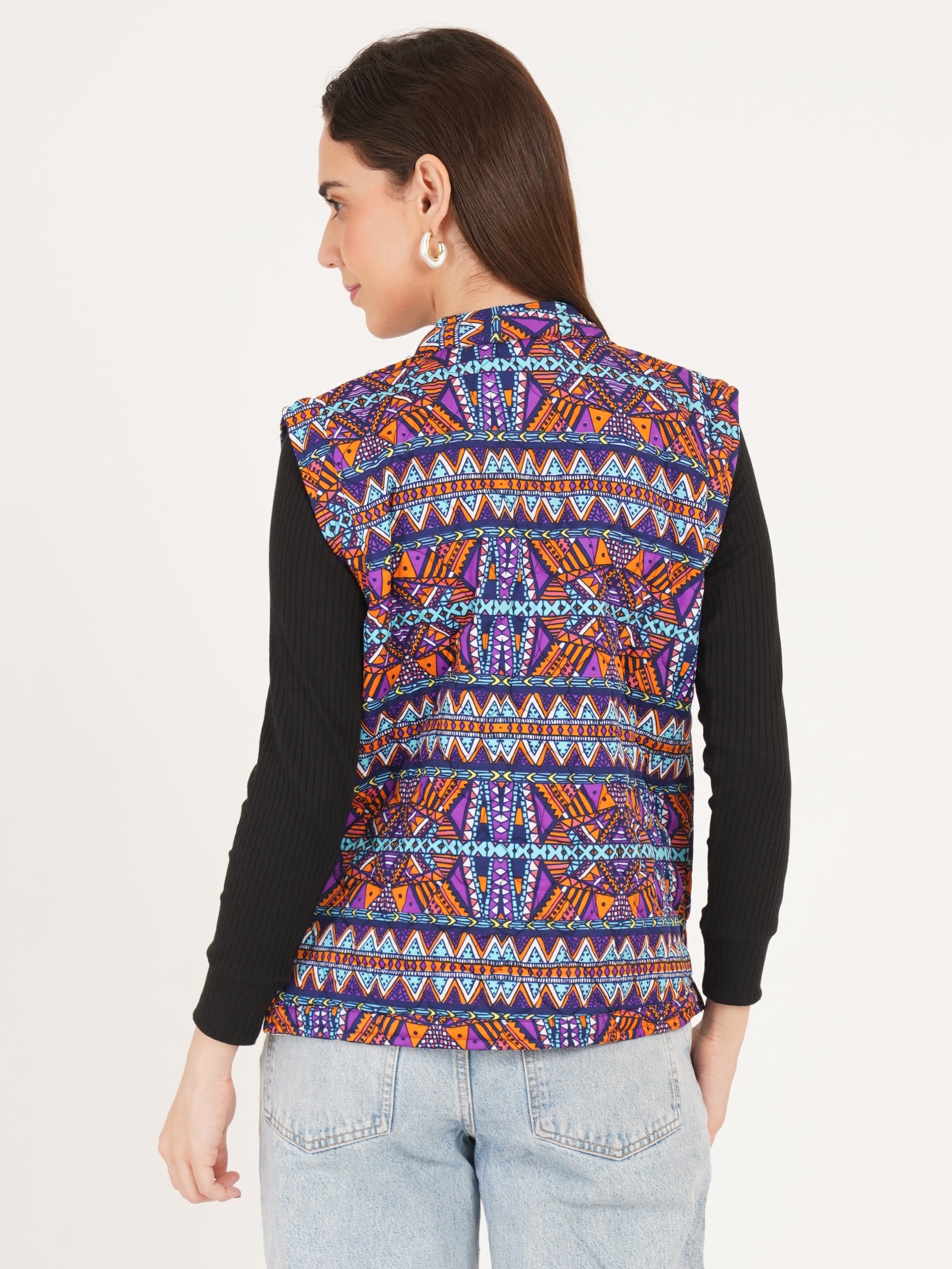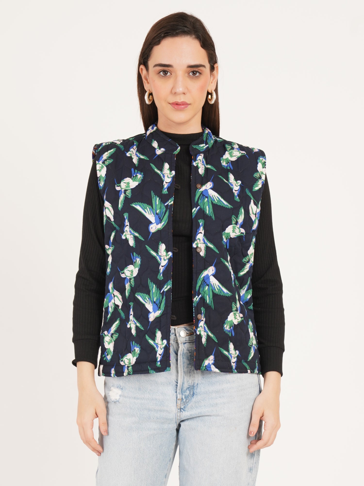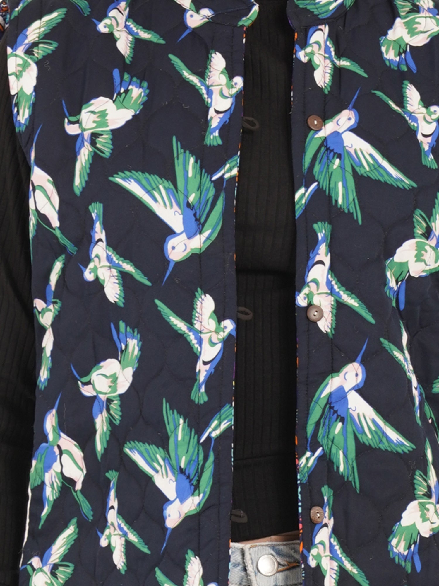 Women Multicolor Printed Woven Design Quilted Reversible Nehru Jacket