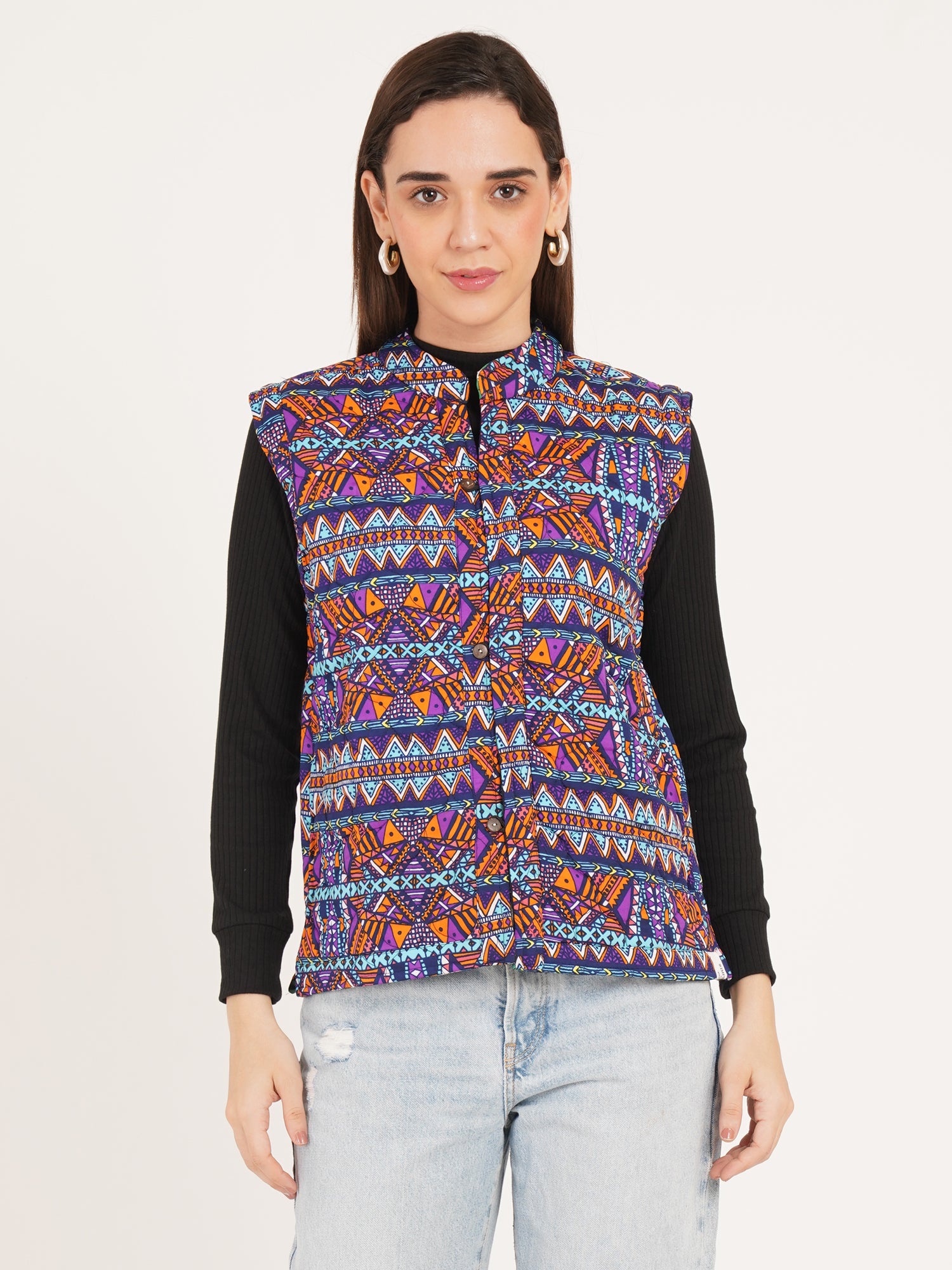 Step into effortless elegance with this multicolor reversible Nehru jacket from IX IMPRESSION. Designed in a stylish woven pattern, it features soft quilting for warmth and comfort. The reversible style lets you switch between a vibrant printed side and a solid classic tone — perfect for any mood or occasion. With its sleeveless cut, Nehru collar, and front button closure, this jacket brings a refined yet versatile touch to your wardrobe.