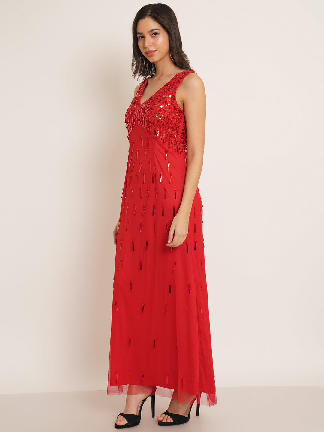 9 Impression Women Red Embellished V-Neck Maxi Gown is a stunning and elegant evening dress. This gown features a deep V-neck neckline and is designed with intricate embellishments, adding a touch of glamour to your look. With its full-length design, it's perfect for formal events and special occasions where you want to make a lasting impression. The bold red color is sure to turn heads, and the gown's flattering silhouette is designed to enhance your beauty. It's a go-to choice for those seeking a sophisticated and eye-catching outfit for a memorable evening.