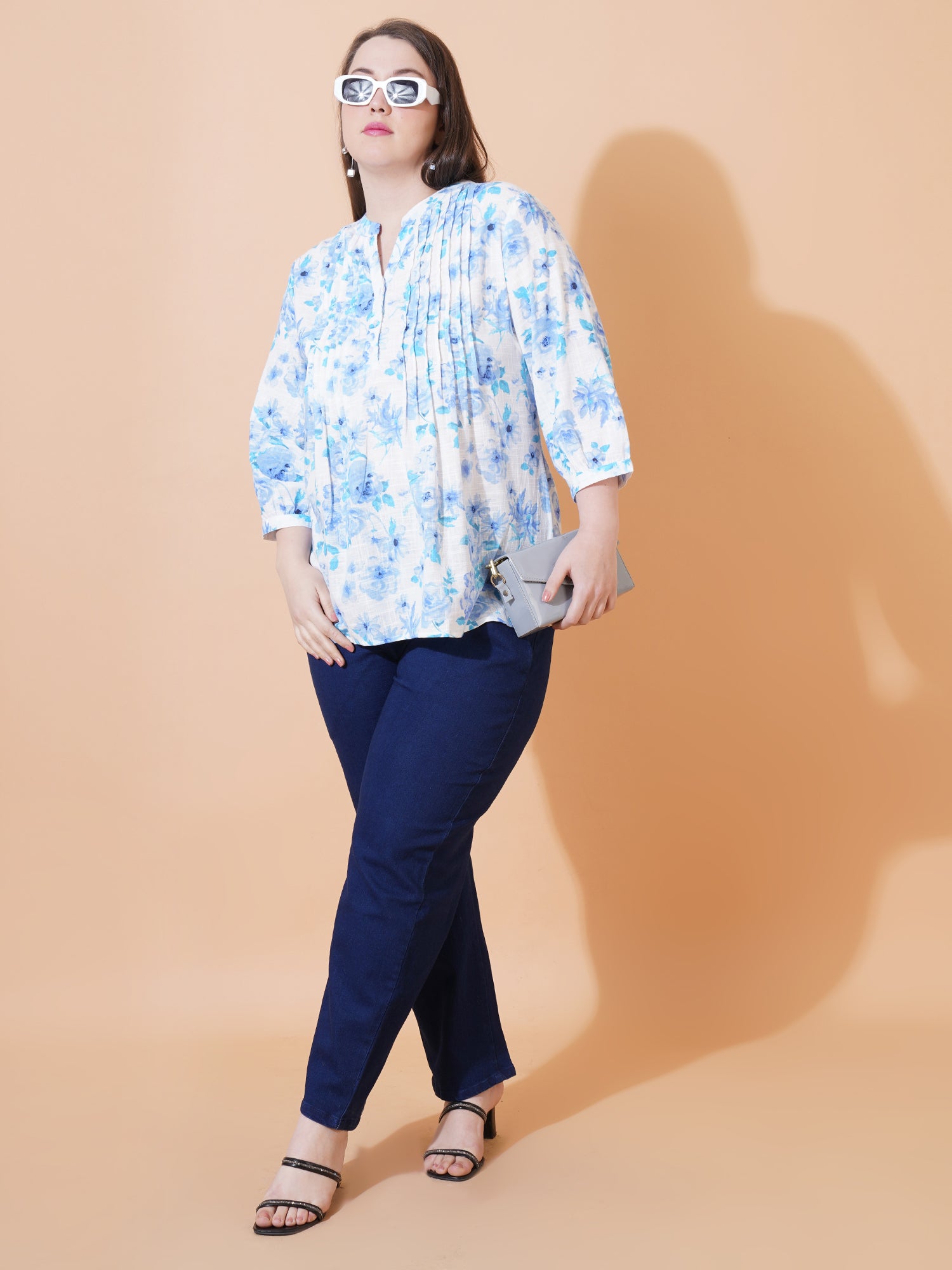 Women White & Blue Floral Print Pintuck Plus Size Top